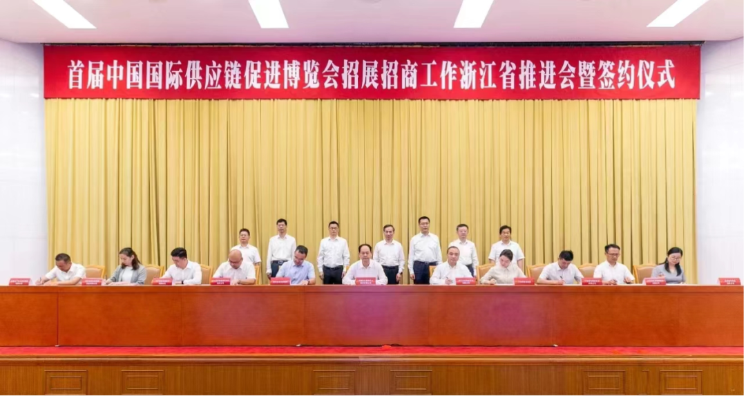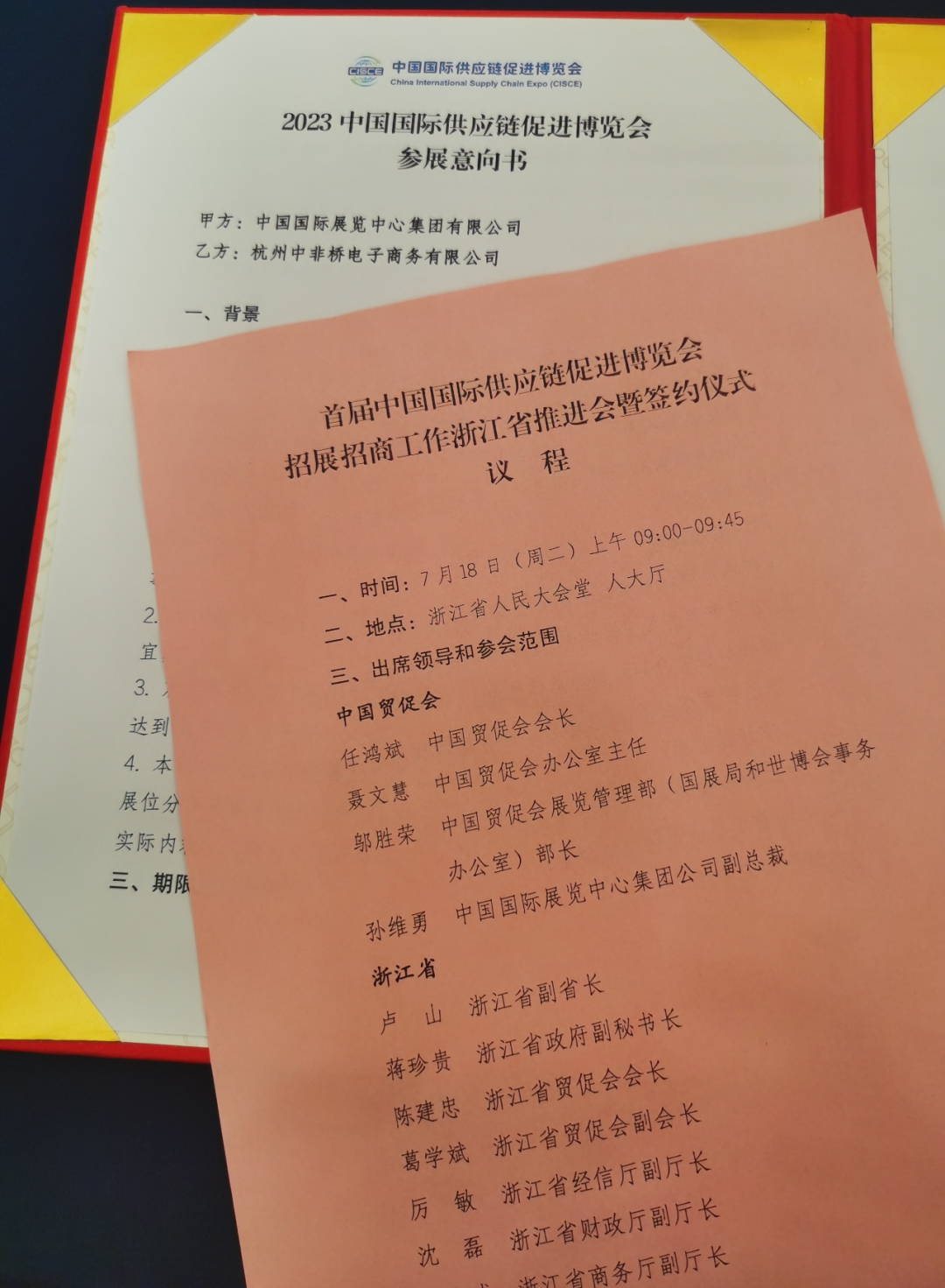 7月18日,首届中国国际供应链促进博览会招展招商工作浙江省推进会暨签约仪式在杭州举行。中国贸促会会长任鸿斌、浙江省副省长卢山出席会议并讲话。中非桥作为全省筛选的45家供应链服务代表性企业之一参加了会议及签约。