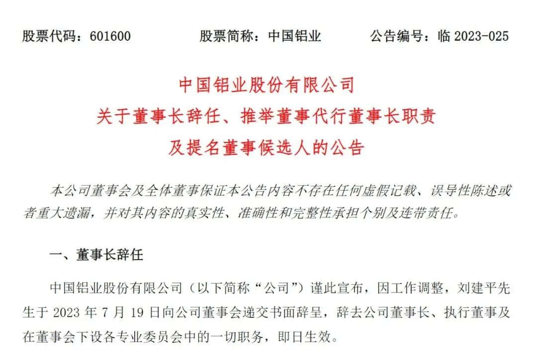 7月19日晚,中国铝业公告,因工作调整,刘建平于2023年7月19日向公司董事会递交书面辞呈,辞去公司董事长、执行董事及在董事会下设各专业委员会中的一切职务,即日生效。