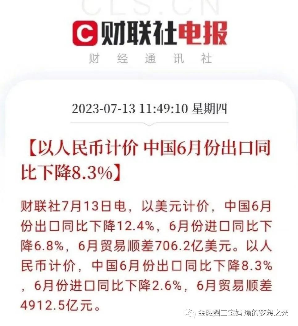 以美元计价,中国6月份出口同比下降12.4%,6月份进口同比下降6.8%,6月贸易顺差706.2亿美元;