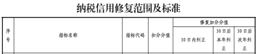 国家税务总局公告2021年第31号规定:纳税信用修复范围及标准,加分分值根据补办时间与失信行为被税务机关列入失信记录的时间间隔确定,在30日内、本年内、次年内纠正的。