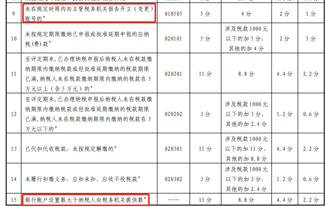 “经常性指标信息”010505.未在规定时限内向主管税务机关报告开立(变更)账号的,扣5分;