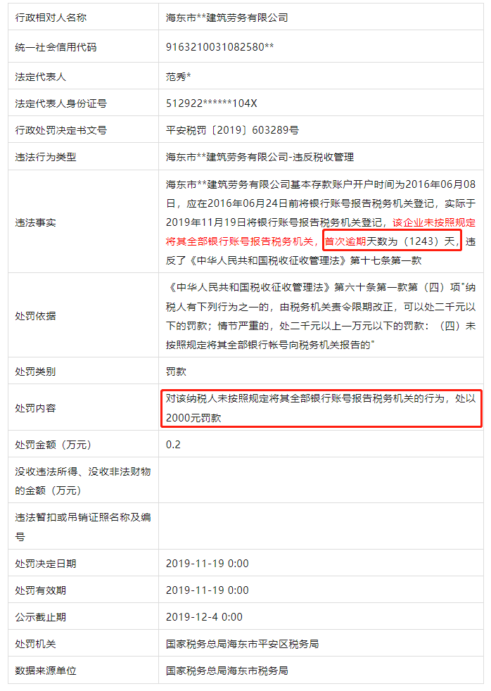 最近,头条君在网上就看到一家企业未按照规定将其全部银行账号报告税务机关违法税收管理罚款2000元。具体如下图所示: