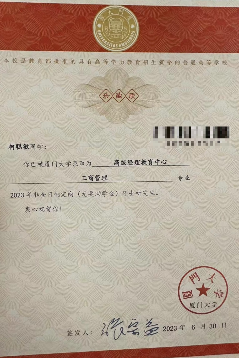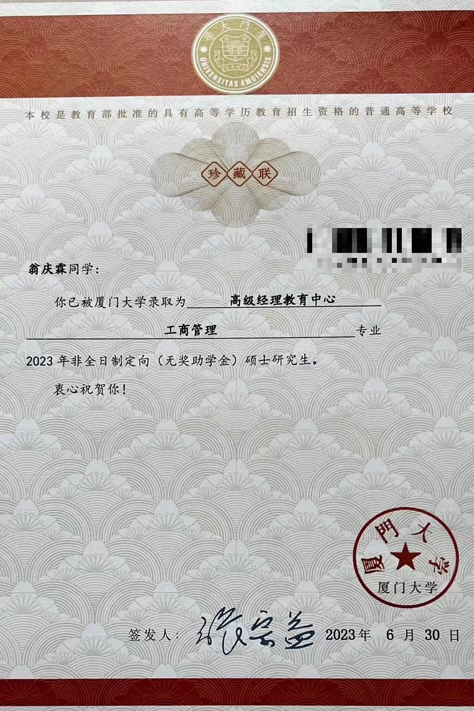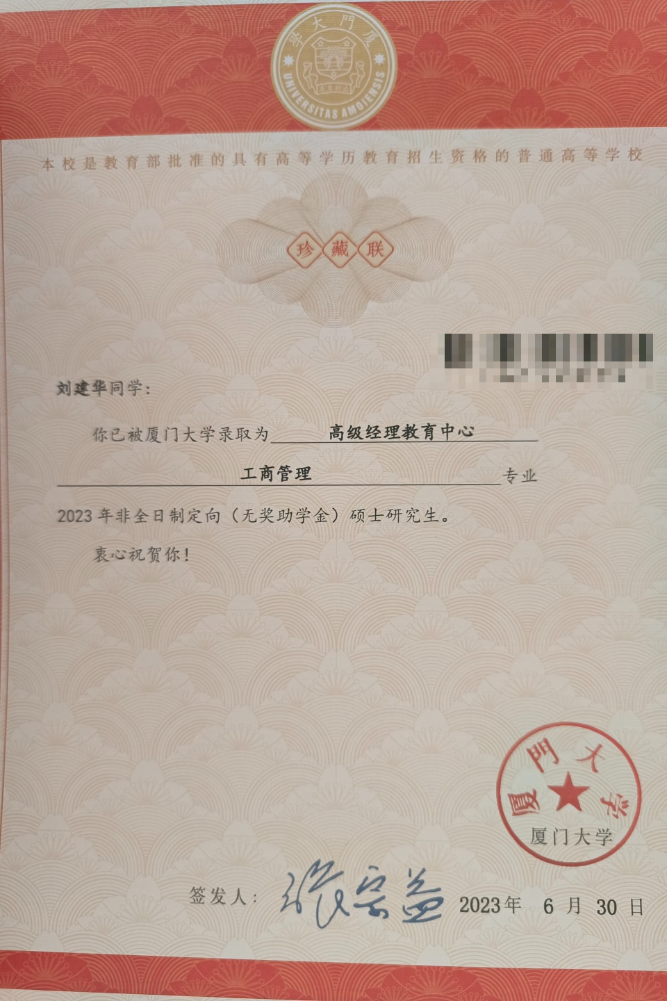 日前,厦门市现代物流业商会常务副会长刘建华(港联运通)、翁庆霖(普洛斯)和柯聪敏(大顺)分别被厦门大学录取为2023级EMBA硕士研究生。这是商会倡导的建设学习型组织、鼓励会员参加继续教育的重要成果之一。
