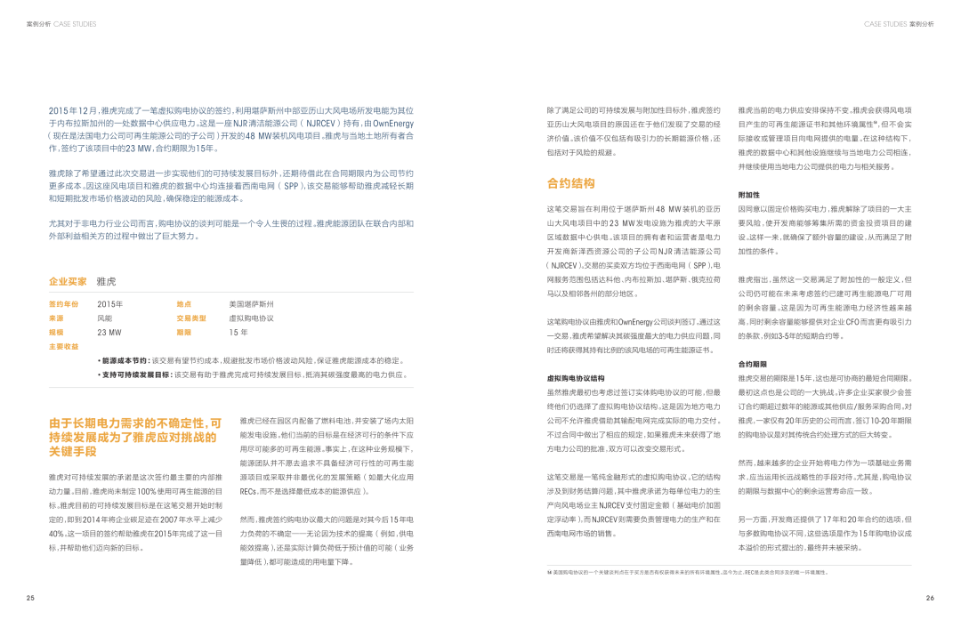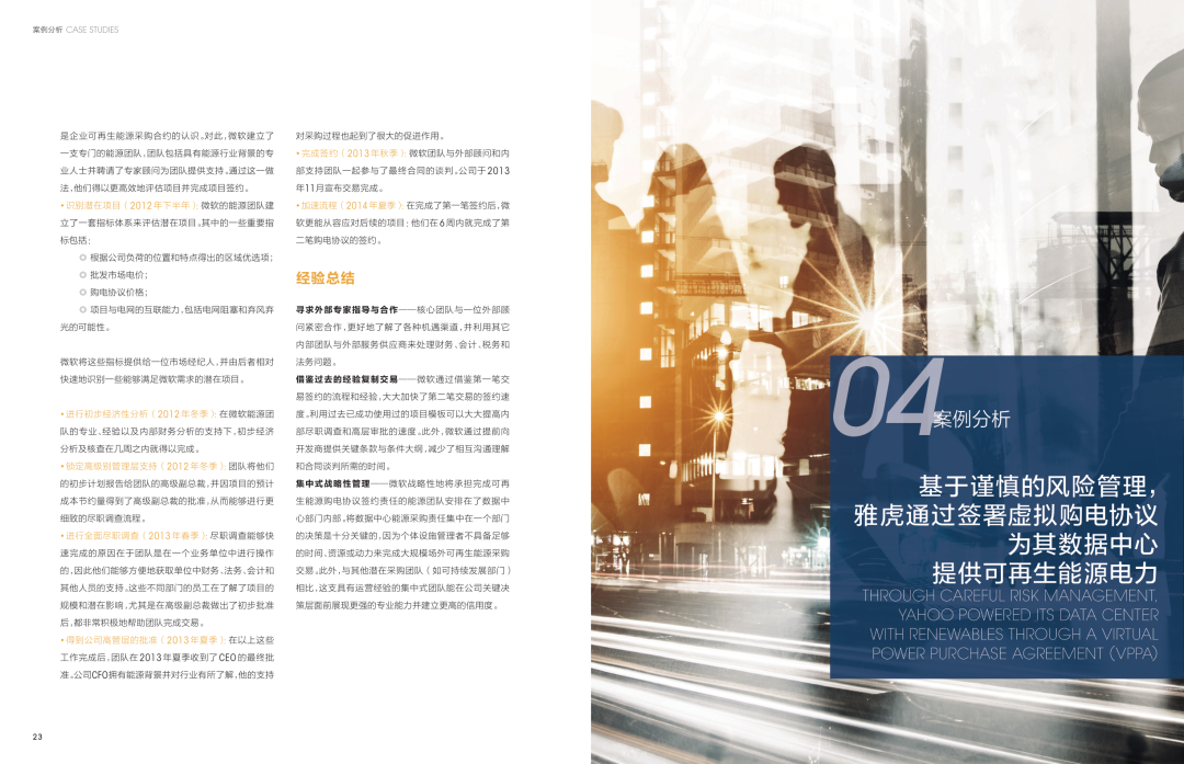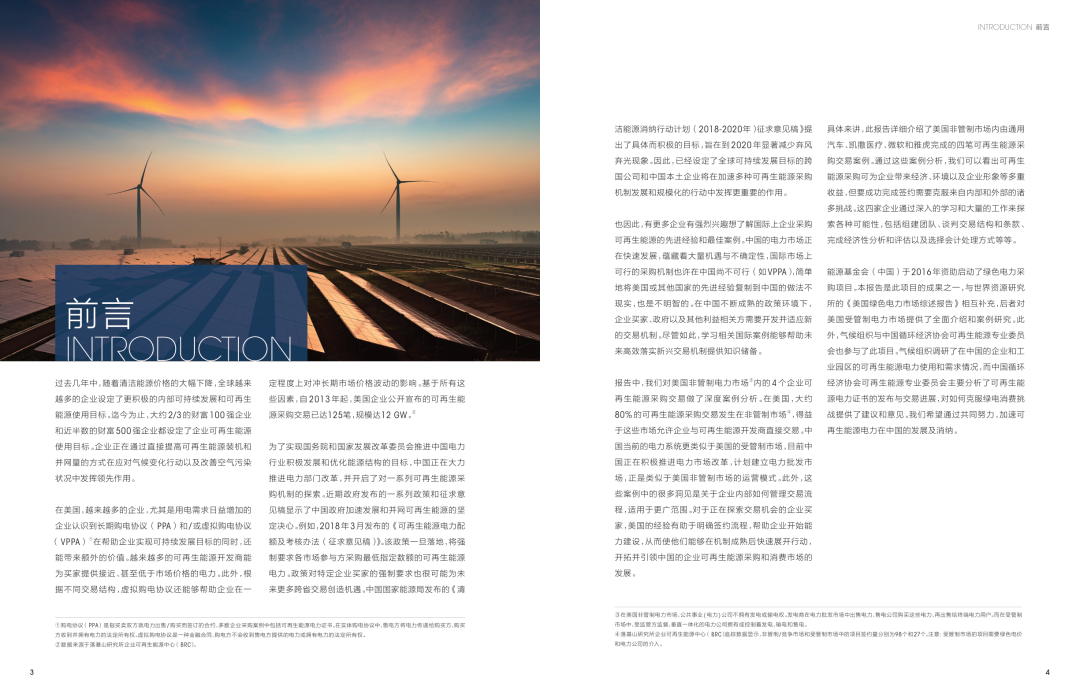 近年来,随着可再生能源价格不断下降,以及可再生能源所能带来的环境优势进一步得到大众认可,全球越来越多的企业承诺使用可再生能源电力,制定更积极的企业可持续发展目标,在应对气候变化行动中发挥日益重要的作用。该报告对美国非管制电力市场内四个企业的可再生能源采购交易做了深度分析,探索美国非管制电力市场和企业的内部交易流程管理对美国企业落实可再生能源采购项目的促进作用。报告为中国可再生能源采购市场的建设提供借鉴,其总结的美国经验有助于中国企业开展能力建设,开拓并引领中国企业可再生能源采购的发展。