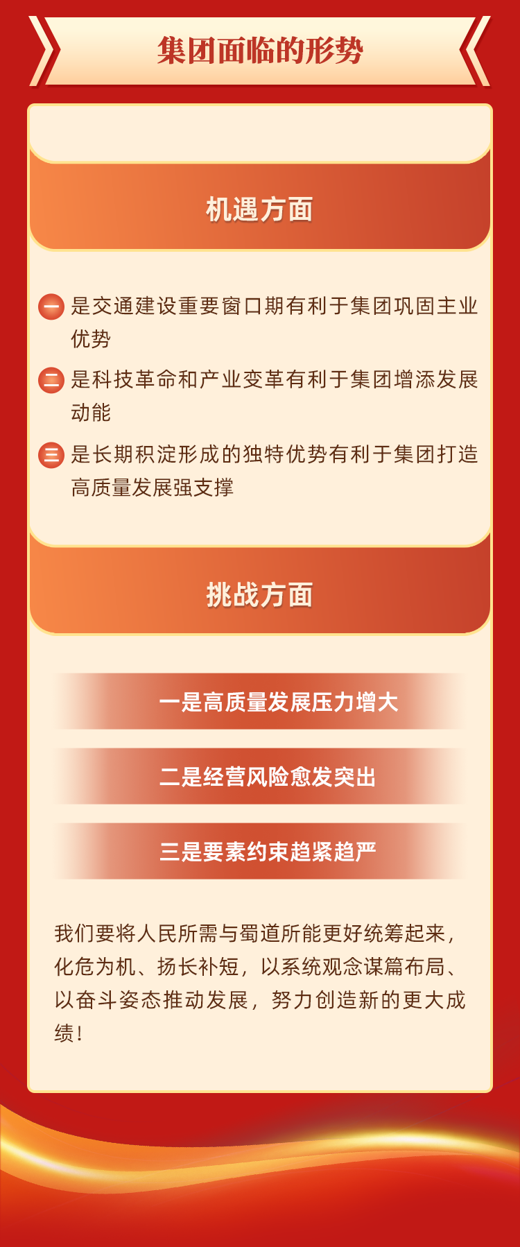 实现碳达峰、碳中和,是着力解决资源环境约束突出问题、实现中华民族永续发展的必然选择,是构建人类命运共同体的庄严承诺。蜀道集团深刻践行“双碳”战略,以高质量发展为主题,以产业转型升级为主线,以改革创新为主轴,抢抓碳达峰、碳中和战略机遇,充分发挥自身运营经验、技术优势及研发能力,坚持科技、绿色双轮驱动,加快推动传统交通基础设施行业转型升级,积极构建“ 交通+ ”产业生态,探索在资源高效利用和绿色低碳发展基础上的高质量发展。