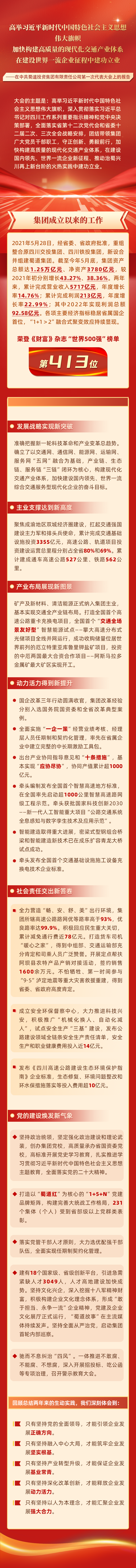 2022年,蜀道集团资产总额超1.19万亿元,净资产超3680亿元,营业收入超2400亿元,实现利润总额92.58亿元,各项主要经济指标稳居省属国企首位,成功跻身“世界500强”第413位。