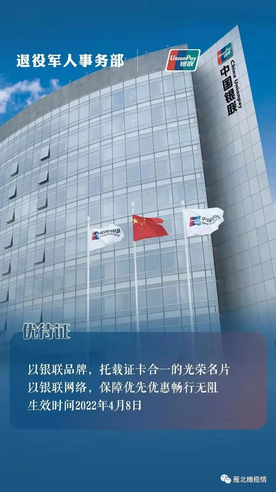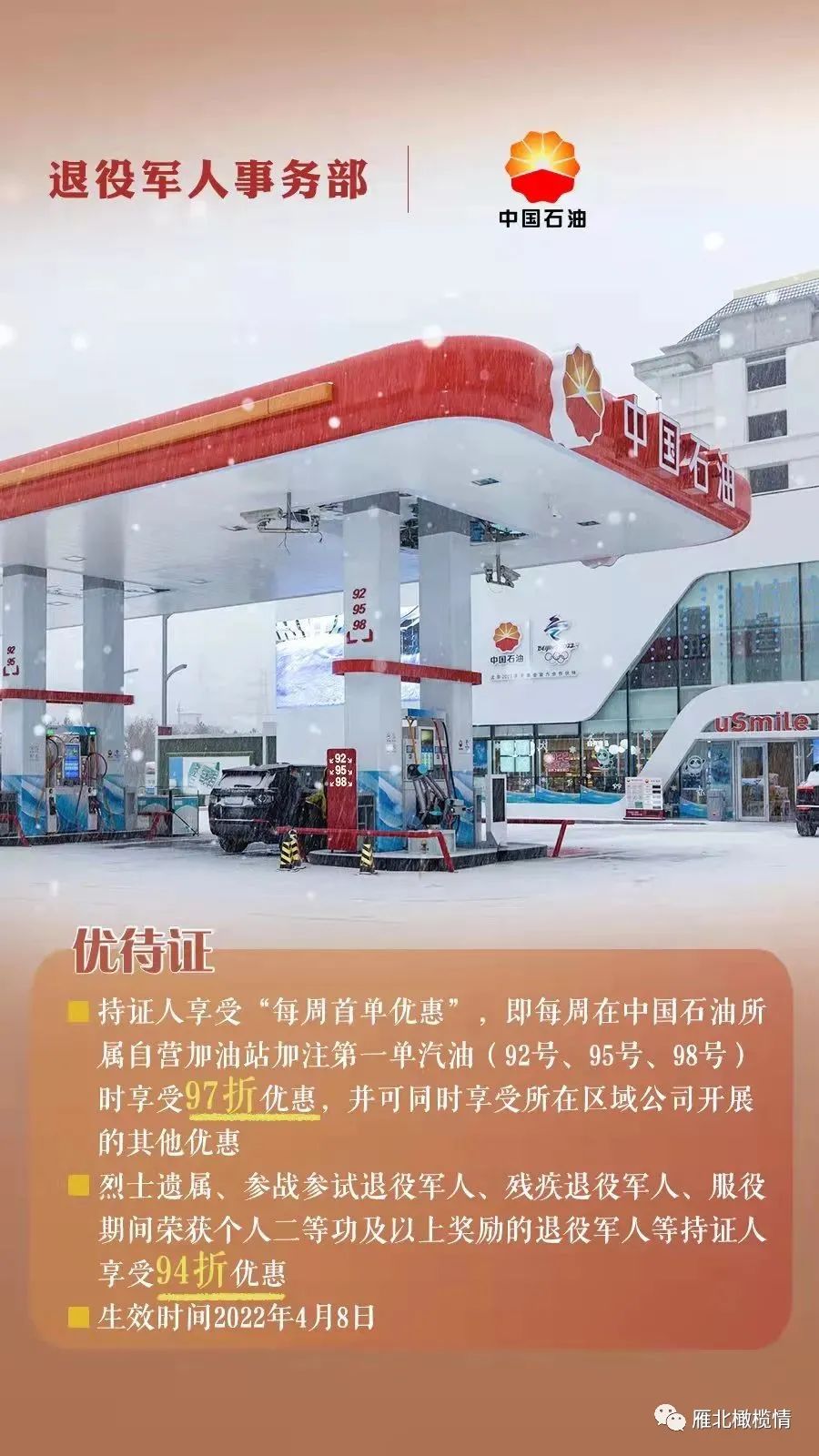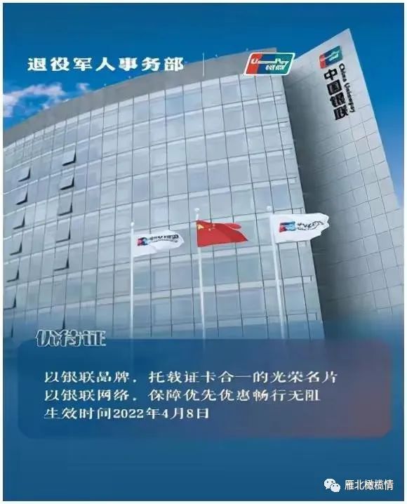 自从2022年2月28日退役军人事务部与中国银联、中国石油、中国邮政、顺丰集团、德邦快递、中国联合航空等6家企业在京签署《拥军优抚合作协议》以来。一年来这6家企业是否按照承诺,将“优待与贡献匹配”的原则,结合自身业务领域,为广大退役军人、其他优抚对象优待证持证人真正提供了相应的优惠服务和专属的优先服务。实际上关于这六大企业为我们退役军人提供优待服务的消息,战友们基本都从不同的渠道知道了。也就是中国银联、中国石油、中国邮政、顺丰集团、德邦快递以及中国联合航空。我们先一起来看看这些企业为我们这个群体提供优待服务?一组海报带你读懂!