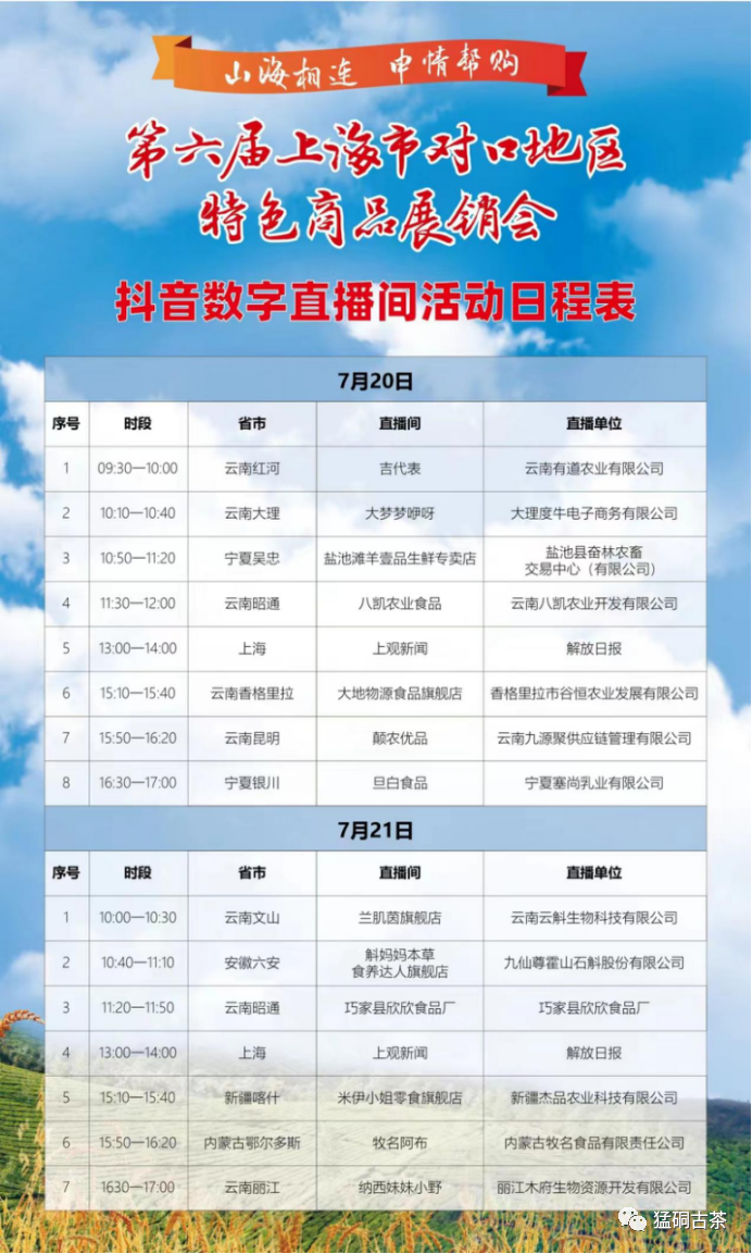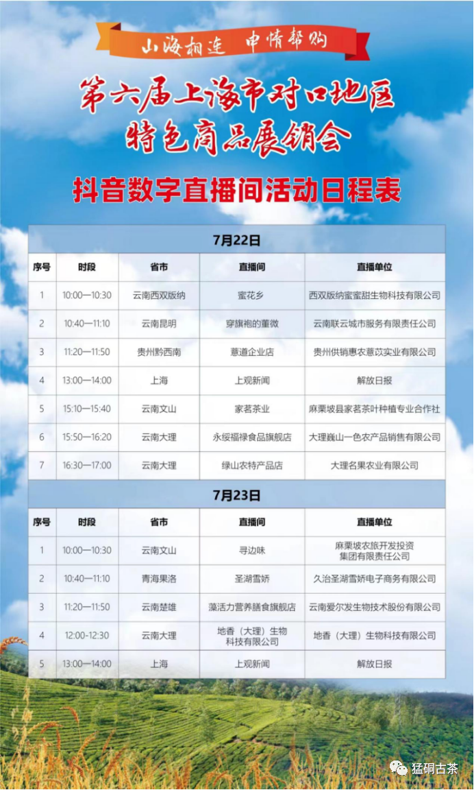活动时间2023年7月20日—23日,家茗茶叶抖音平台直播活动时间为2023年7月22日下午15:10—15:40抖音搜索话题#山海相连申情帮购,进直播间更多福利等您哟~