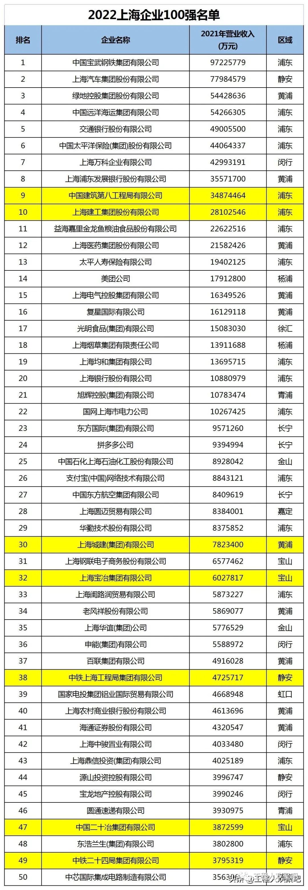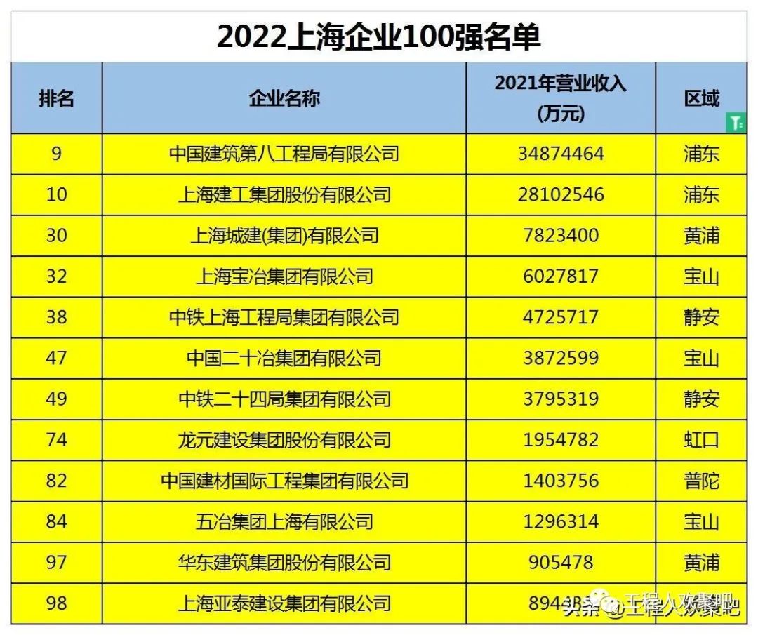 2022年上海百强企业发布,有12家建筑施工企业上榜,中建八局和上海建工挤进前10名,位列第9、10名。基本以国央企为主,民企仅有2家上榜。