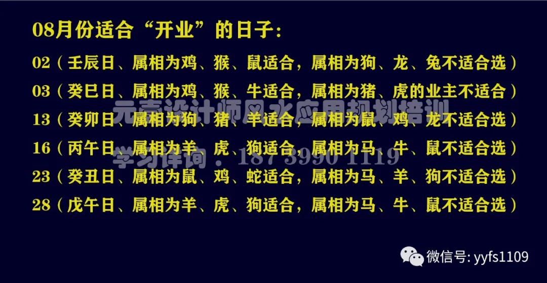 特别备注:首先、上述图片中所展示时间均为阳历时间。第二、咱们现在所排布的店面和公司开业的吉日,已经给出本日与属相之间的之间的刑冲,以备大家在选用时候参考。第三、店面和公司开业的吉日选择,一般情况下是以公司法人属相,以及八字中的日元与本日天干之间的刑冲作为主要参照。若是能够与公司的主要领导也没有刑冲是最佳选择。