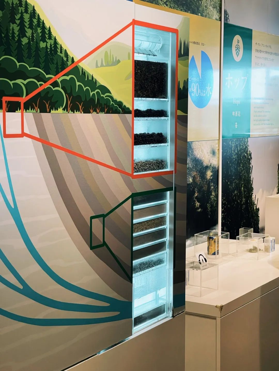 三得利啤酒以“天然水”为特色。这个机器正在演示天然水如何形成。