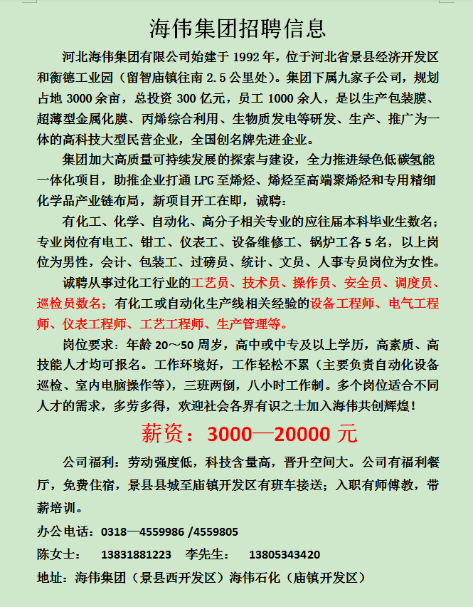 一、销售经理(5名):2年以上销售行业工作经验,化工、机械设备行业销售管理工作经历者优先,薪资面议。
