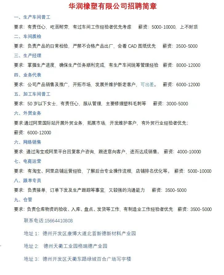 4、质检、仓库管理员、内勤等文员3_5名,薪资面议。