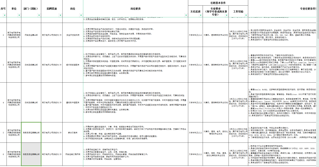 本次招聘同时面向南方电网公司系统内、外开展,共计6个岗位,工作地点均位于广东省广州市。具体岗位、任职条件要求等详见《公开招聘岗位职责及任职条件》(附件1)。