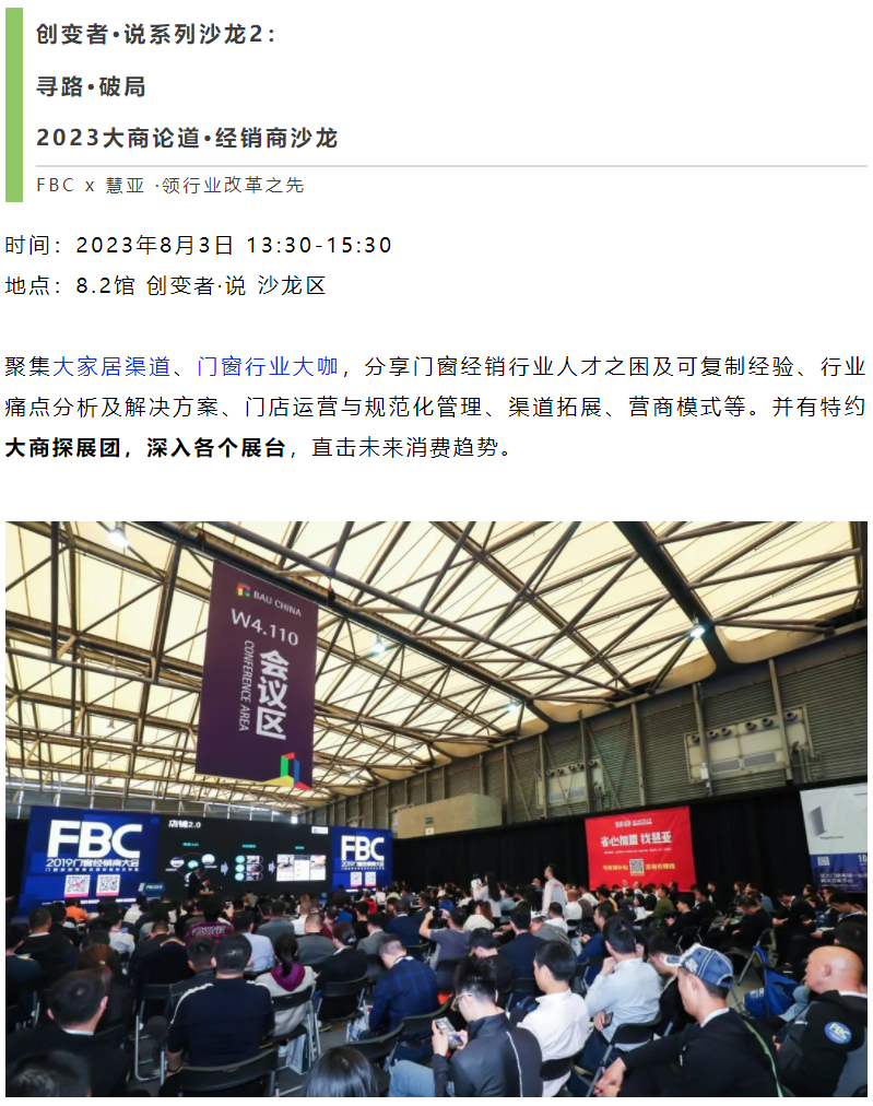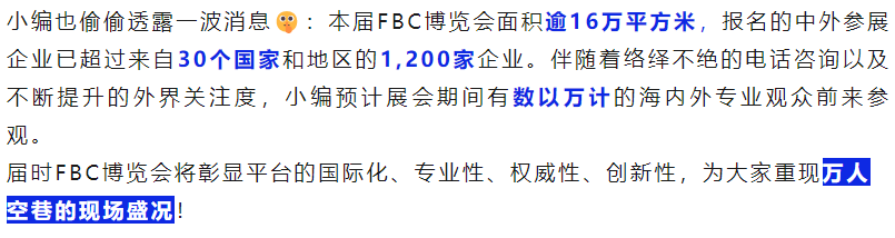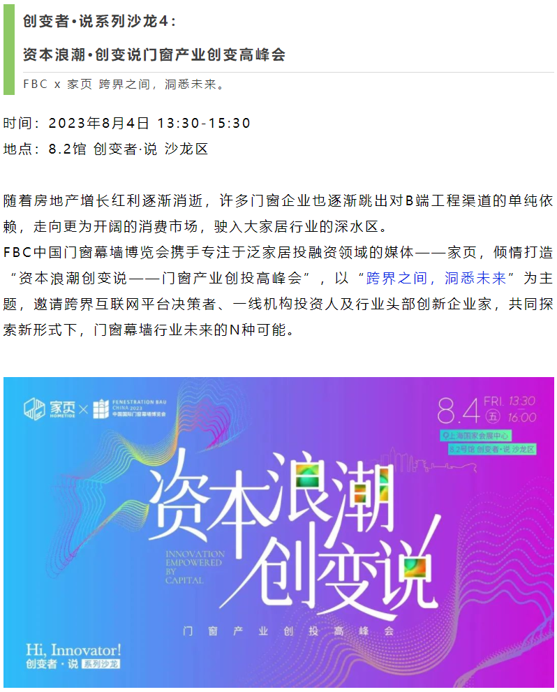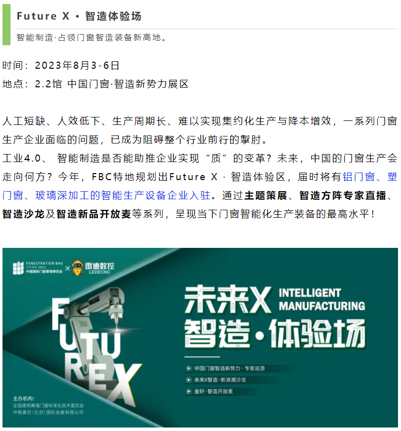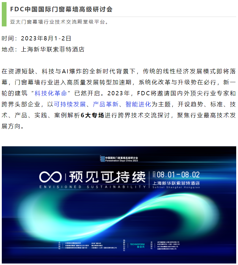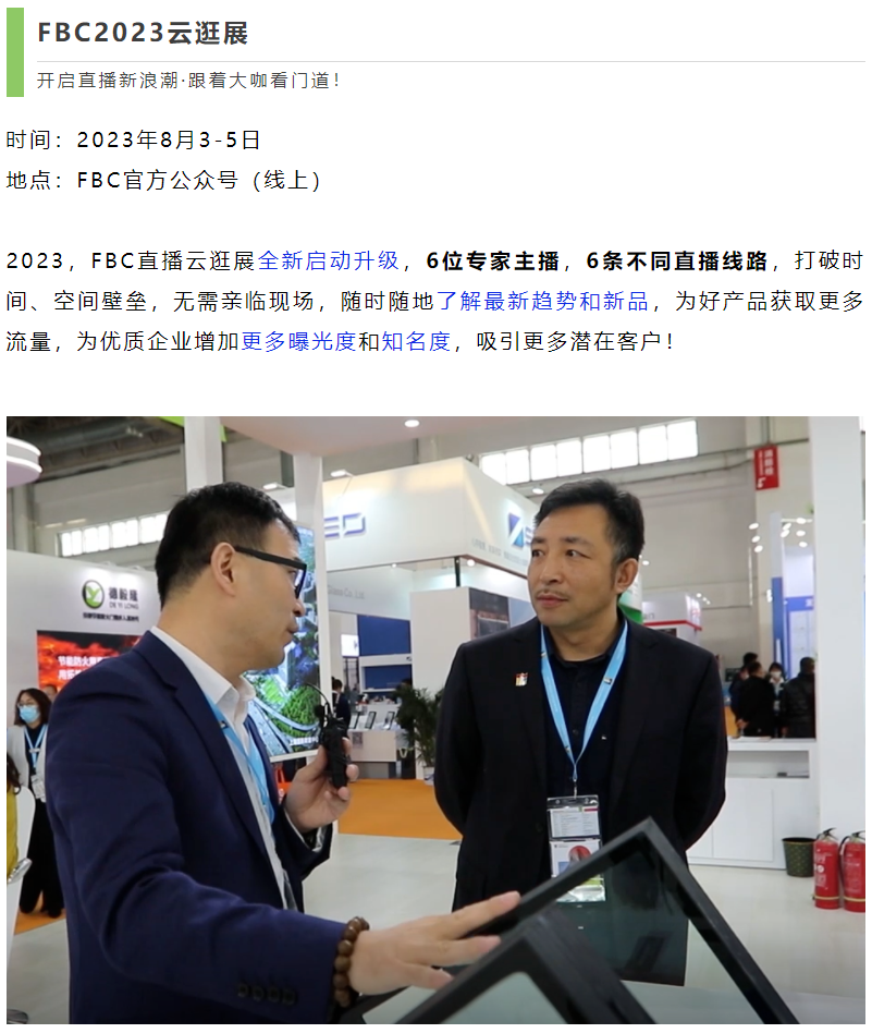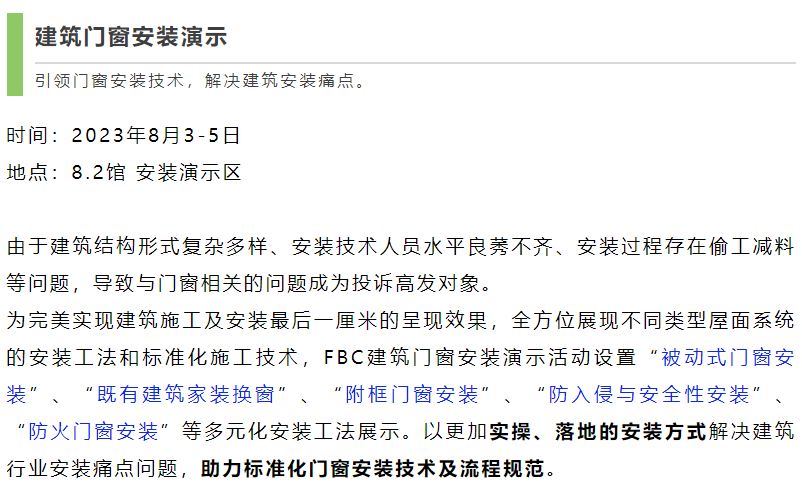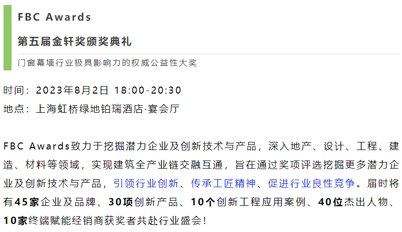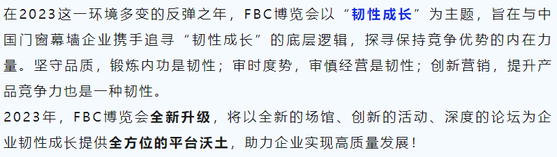 2023年8月3-6日,FBC中国门窗幕墙博览会(FBC博览会)将在上海隆重举行。作为亚太地区门窗幕墙领域最具知名度与影响力的年度盛会之一,FBC中国门窗幕墙博览会(以下简称“FBC博览会”)现已成为知名亚太门窗幕墙一站式解决方案平台。门窗、五金、密封、设备、玻璃等等门窗幕墙行业相关的产品统统都有;平台也为各个企业提供丰富的品牌推广、产品展示、交流合作的行业价值链接机会。