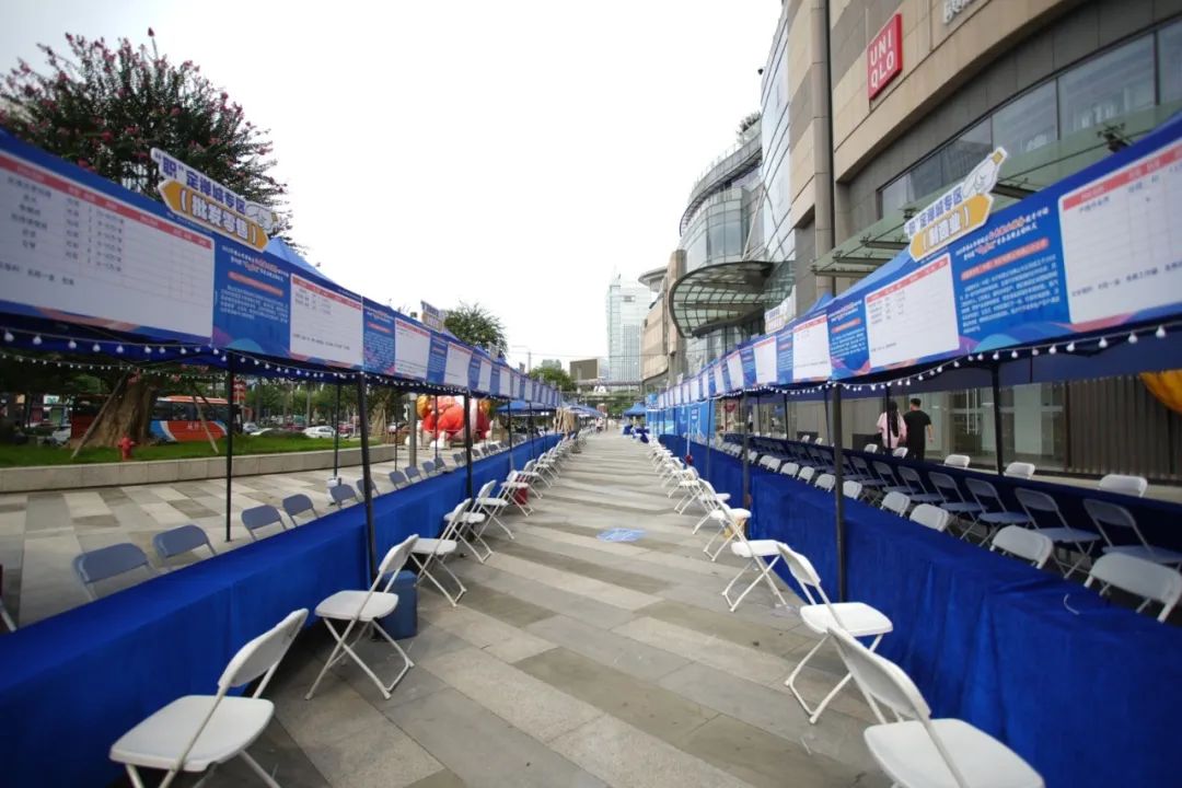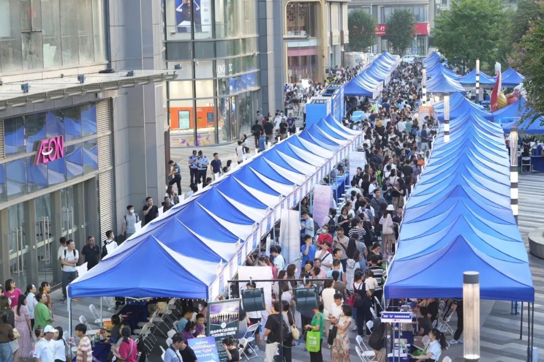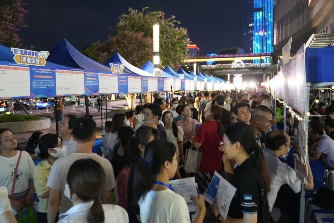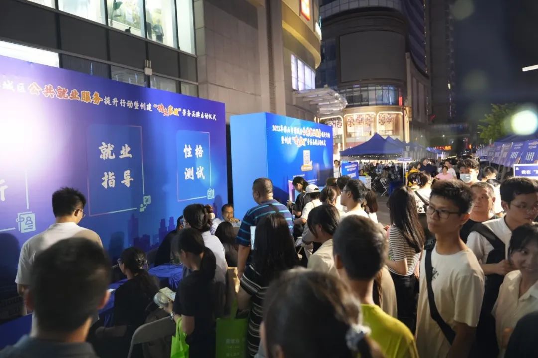 活动现场同步开展大型人才夜市招聘会活动,本次活动共有500家企业参与,提供8000余个岗位,吸引1万余人求职者驻足观看。现场开设三个专区,直播带岗专区、空中双选会专区、职业指导服务专区,为求职者提供全方位的政策解读服务、岗位介绍服务。