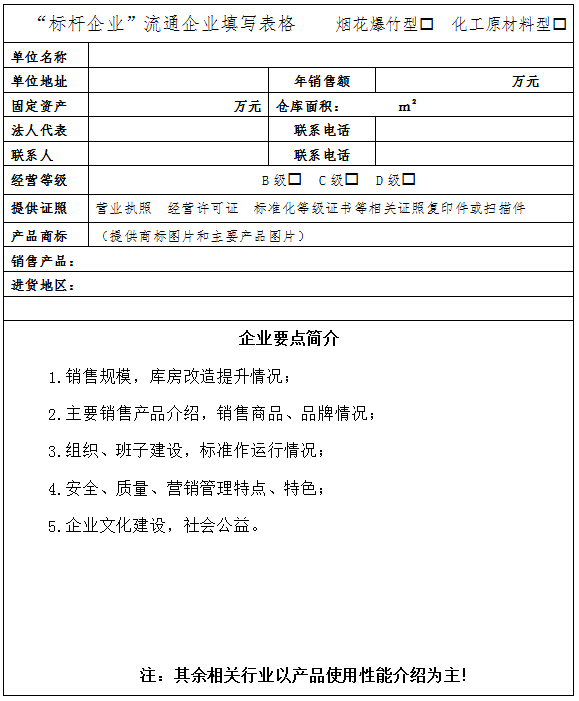 主要指在安全管理、生产(经营)管理、标准化创建(运行)、科研创新、产品质量、污染整治、劳动保护等方面,有突出效果,走在同行业前列的企业,主要包括烟花爆竹生产企业和流通企业(含原材料经营),以及相关的机械制造企业(含运输车、防爆箱生产)、化工原材料生产企业等,每期将推6-12个标杆企业(包括并不限于)。