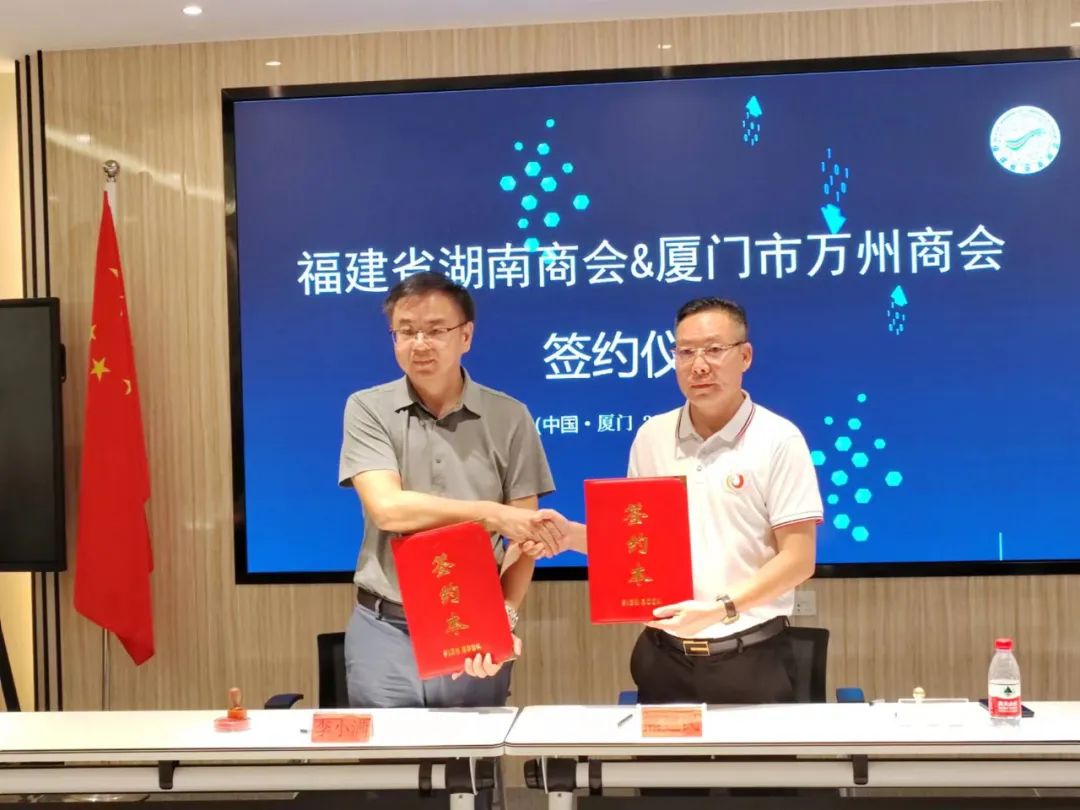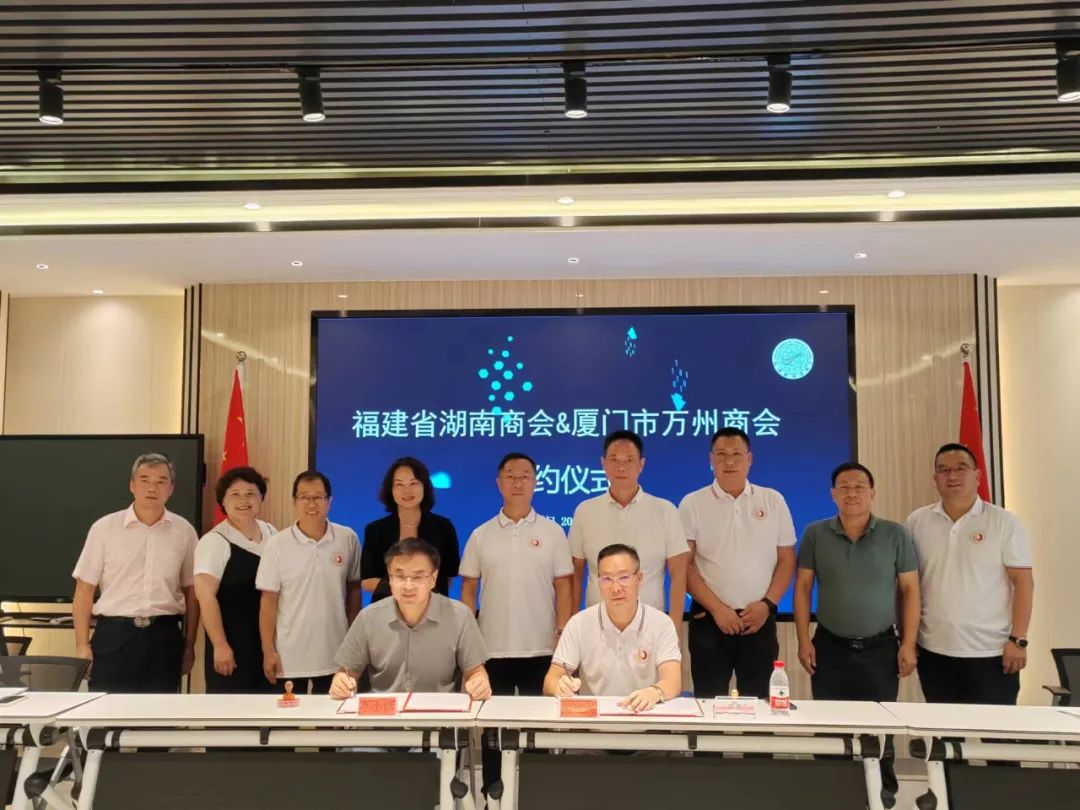 7月21日下午,商会会长熊建民带领商会党支部书记邢汝洲,常务副会长何义明、陈铭,执行秘书长夏晓云,秘书刘丽园一行,前往福建省湖南商会交流座谈,受到了福建省湖南商会的热烈欢迎和热情款待。双方签订了战略合作协议,并结为友好商会。