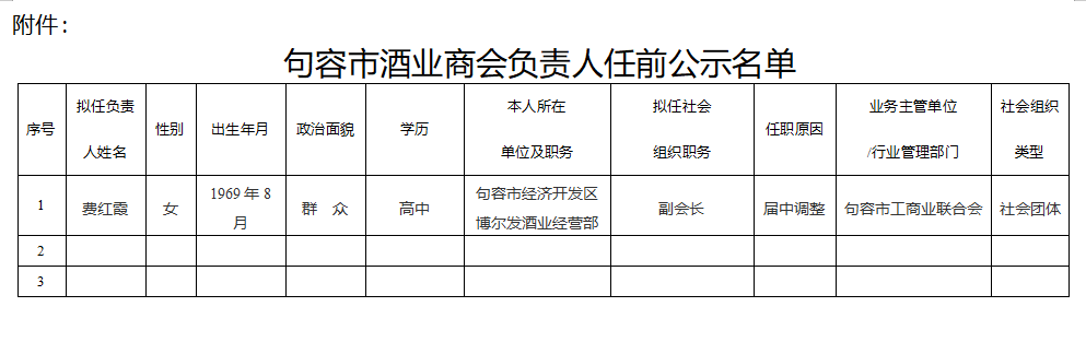 为进一步加强对社会组织负责人任职监督,充分发挥社会组织服务国家、服务社会、服务群众、服务行业的作用,按照社会组织相关条例以及中共中央办公厅、国务院办公厅《关于改革社会组织管理制度促进社会组织健康有序发展的意见》有关规定,根据社会组织申报,经工商联审查,现将拟任句容市酒业商会负责人予以公示(名单见附件)。