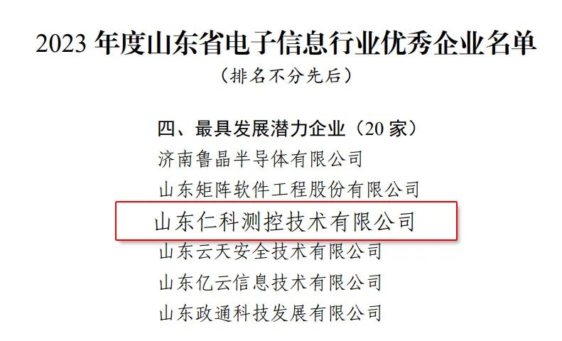在本次评选活动中,山东仁科测控技术有限公司荣获“2023年山东省电子信息行业优秀企业最具发展潜力企业”称号。