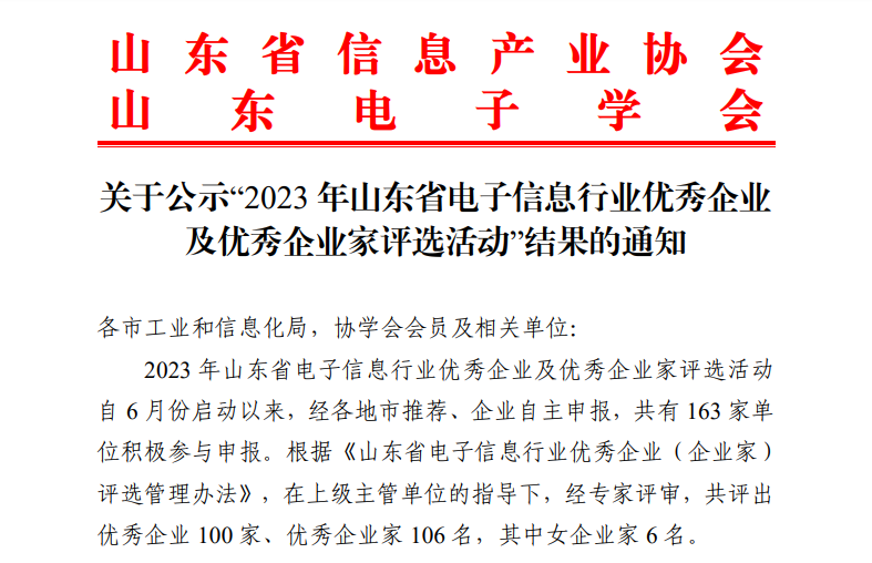 近日,由山东电子学会组织开展的“2023年山东省电子信息行业优秀企业及优秀企业家”评选活动完成结果公示。