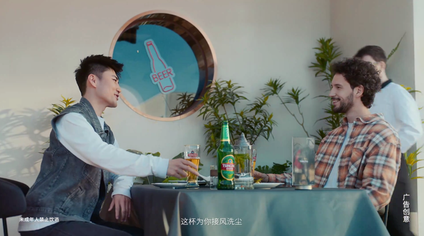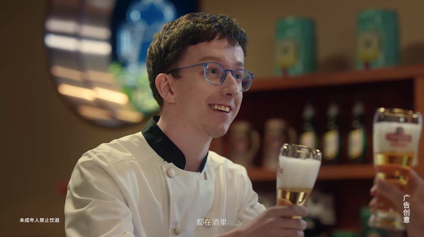 第二个故事《浪潮》则将镜头对准了经历改革开放的年轻人。就像小辉跳脱出思维惯性,放弃铁饭碗,毅然决然南下打拼,“青岛啤酒”此刻隐喻的是一种敢拼、敢闯的时代精神。所以小辉不是独立的个体,是时代的缩影,是青岛啤酒抓住时代机遇乘风破浪(成为国内首家在上海与香港同时上市的企业)的真实写照。第三个故事回扣了当下与未来。在小酒馆里,形形色色的人汇聚于此,肖战饰演的酒馆老板与外国大厨在这里见证了沉甸甸的人情往来。此时的青岛啤酒,隐喻的是一种独有的“中国情义”,它代表的是文化的包容力、传播力和永续力,在历时性中交织了具象的人与情。所以,当你慢慢品青岛啤酒这波《都在酒里》的故事时,并不会觉得乏味,因为它像一本厚重的书,在以小见大,在品牌的个体价值与时代洪流相互裹挟的车轮中,带你穿透历史,完成一种见微知著的探照,展现了一个与时代共振,肩负民族文化崛起的大国品牌形象。塑普世价值共识