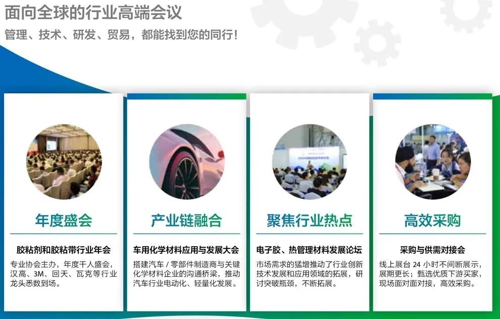 中国国际胶粘剂及密封剂展览会深耕胶粘剂、密封剂、胶粘带和薄膜行业26年,凭借强大品牌影响力和行业号召力,助力专业市场蓬勃发展。我们连接了十几个行业的买家和卖家,包括汽车、电子、 新能源、轨道交通、建材家居、智能包装、工业等重要领域。我们为一系列专业市场注入新生命, 释放机遇,推动用户行业绿色低碳、高性能、安全发展,加速中国制造向全球价值链中高端迈进。