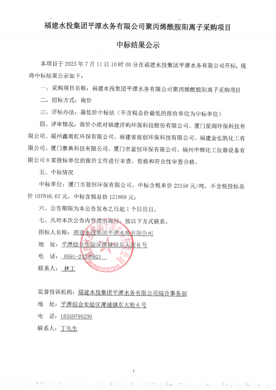 中标结果公示—福建水投集团平潭水务有限公司聚丙烯酰胺阳离子采购项目