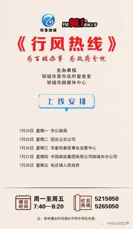 7月25日(星期二)国运公交公司有关负责同志将走进《行风热线》直播间,为您解答相关业务问题。欢迎各位听友在7:40-8:20拨打直播热线:5215050/5265050进行咨询。