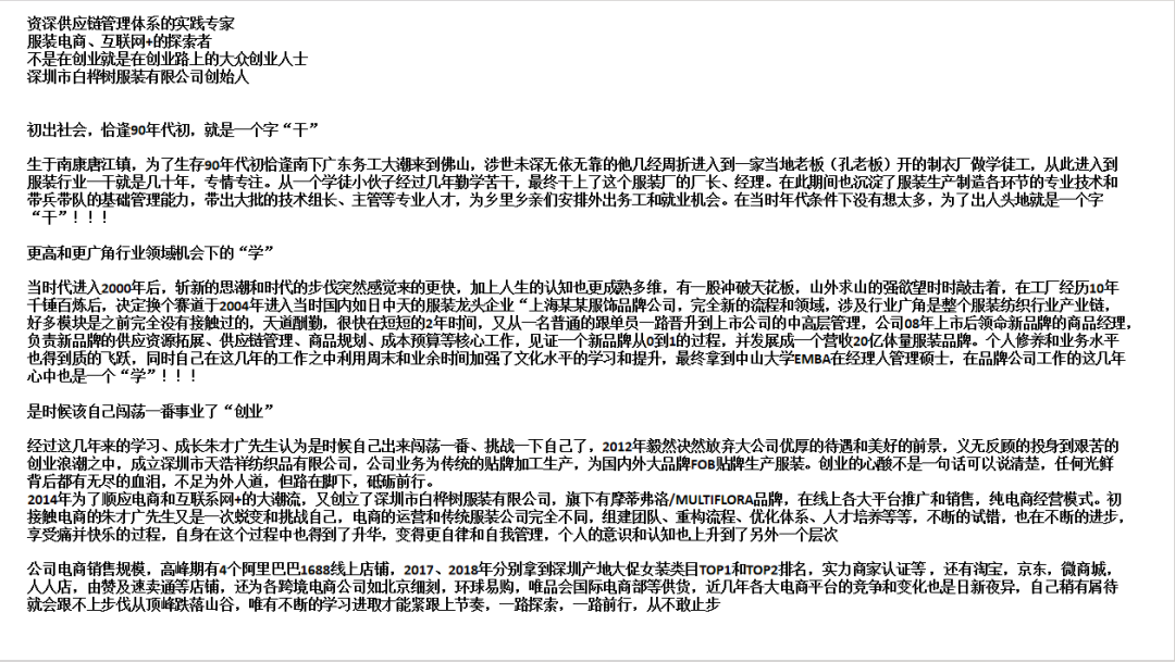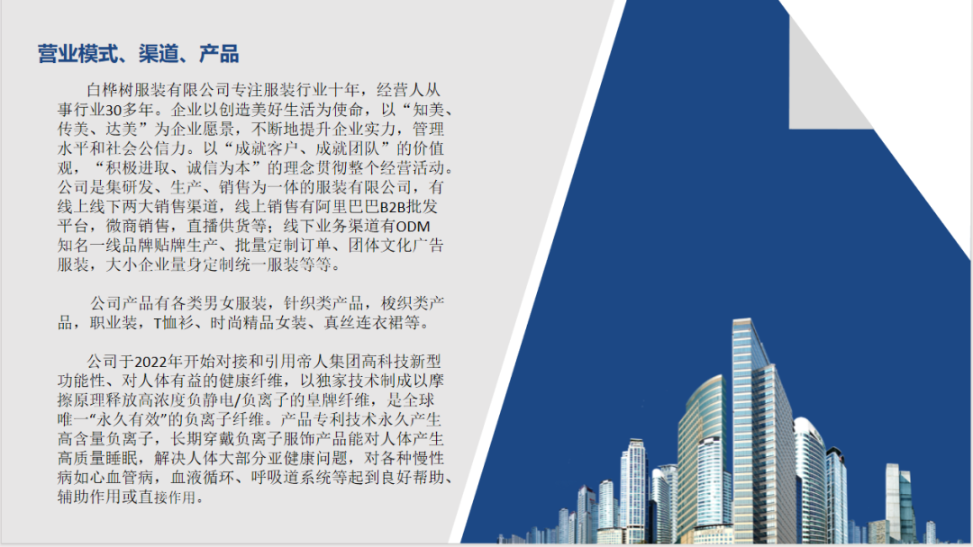 下午16:30,来到白桦树服装公司,朱才广总经理热情接待了参访人员并与大家进行了座谈交流。朱总给大家分享了白桦树的发展状况、自身经历及未来发展方向。首先,非常欢迎深圳南康商会的企业家及乡贤来到公司,心情很激动,感谢秘书处的组织安排,商会走访活动是一个成功的模式,也是一个有凝聚力的粘稠剂,让大家聚在一起。他说自己90年代初来到佛山,几经周折进入到一家当地老板开的制衣厂做学徒工,从此进入到服装行业一干就是几十年,专情专注,从一个学徒小伙子经过几年勤学苦干,最终干上了这个服装厂的厂长、经理,在此期间也沉淀了服装生产制造各环节的专业技术和带兵带队的基础管理能力,带出大批的技术组长、主管等专业人才,为乡里乡亲们安排外出务工和就业机会,围绕一个"干”字,打拼出了自己的一片天地!接着,朱总安排工作人员就公司于2022年对接和引用的日本妮芙露高科技新型织维面料,做健康功能型服饰产品作了详细的介绍并作了现场试验。产品具有高含量负离子,长期穿戴负离子服饰产品能对人体有高质睡眠,解决人体大部分亚健康问题,对各种慢性病如心血管病,对血液循环、呼吸道系统等起到良好帮助、辅助作用或直接作用。有需要欢迎进一步沟通交流。企业简介:深圳市白桦树服装有限公司