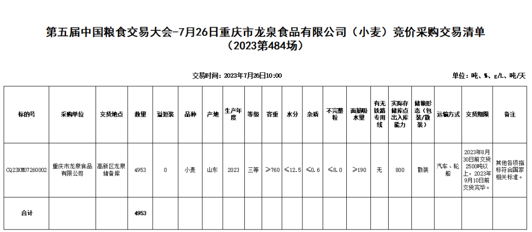 受重庆市龙泉食品有限公司委托,重庆市粮油批发市场有限责任公司(即国家粮食重庆交易中心,以下简称“批发市场”)定于2023年7月26日10:00举办重庆市龙泉食品有限公司(小麦)竞价采购交易会,现将有关事项公告如下: