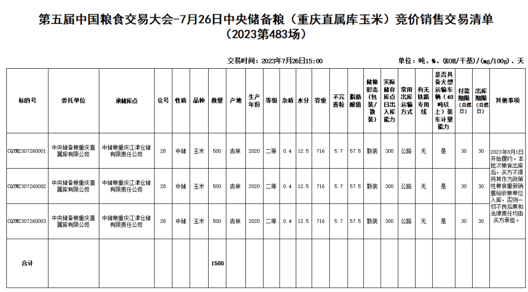 受中国储备粮管理集团有限公司成都分公司委托,重庆市粮油批发市场有限责任公司(即国家粮食重庆交易中心,以下简称“批发市场”)定于2023年7月26日15:00举办中央储备粮(重庆直属库玉米)竞价销售交易会,现将有关事项公告如下: