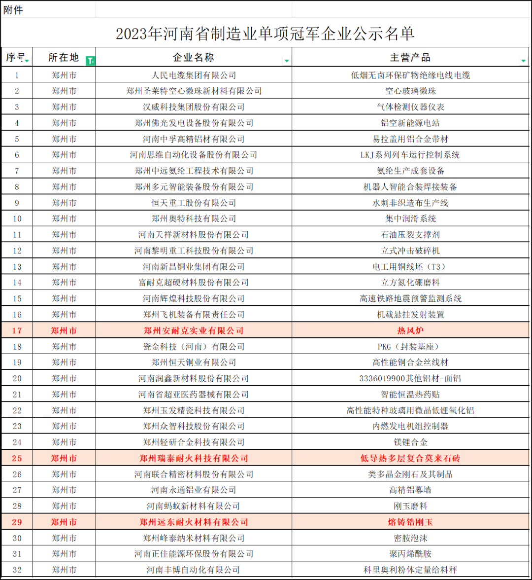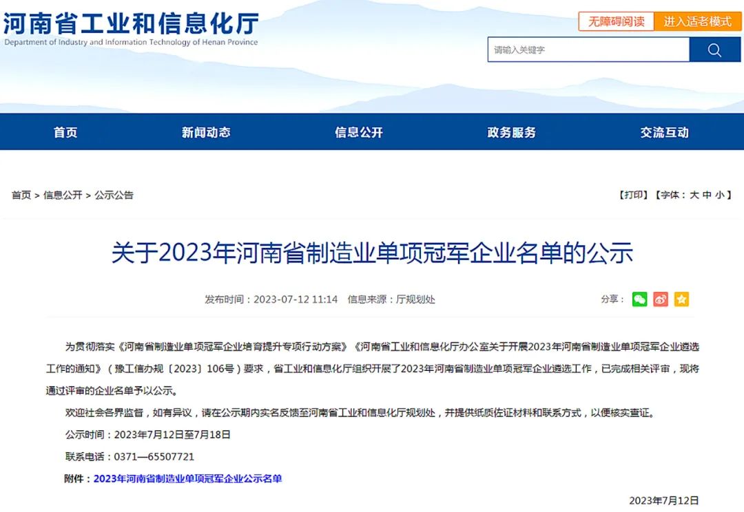 《关于2023年河南省制造业单项冠军企业名单的公示》