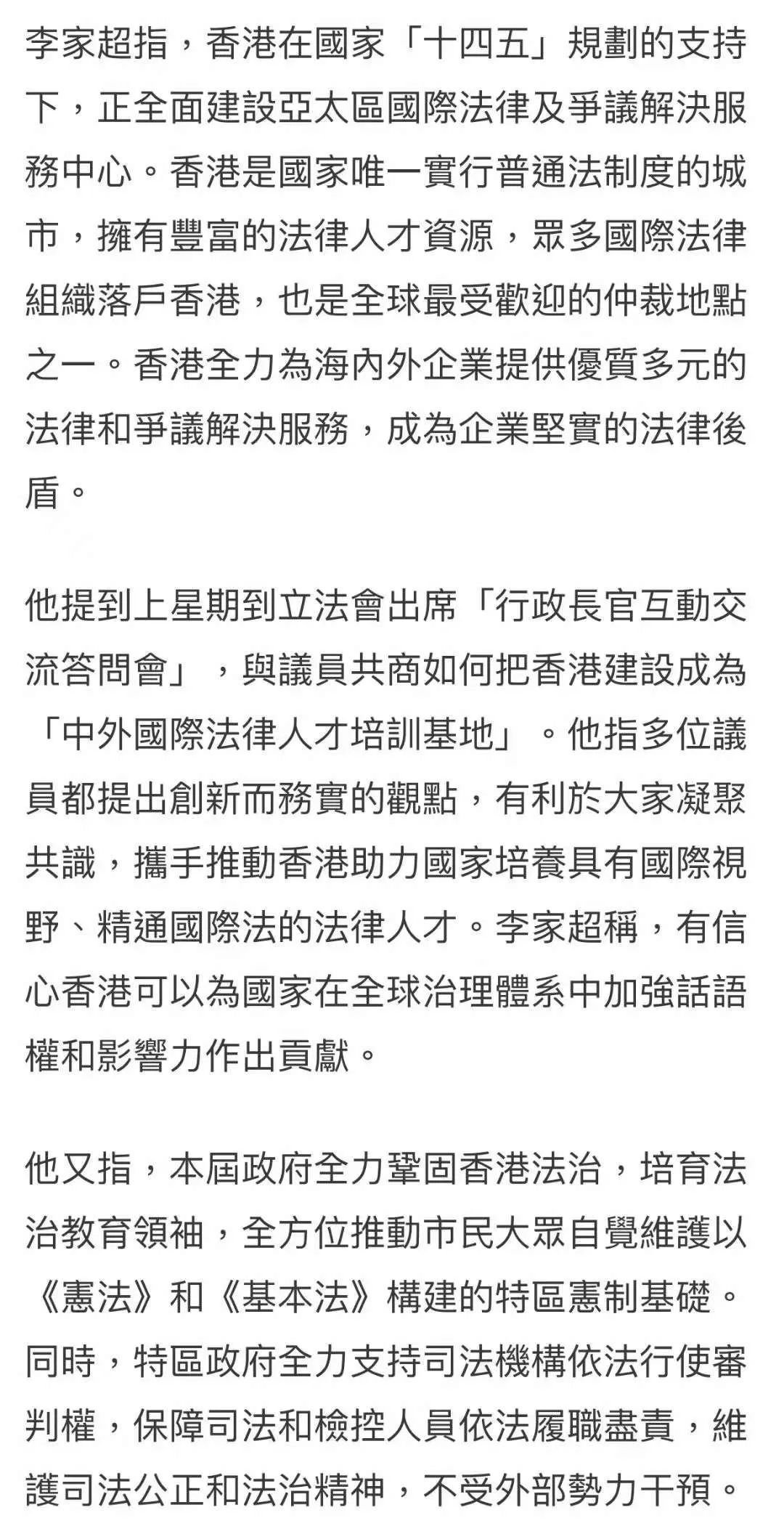 致辞中,李家超重点提到香港积极对接国家就国际法律人才的重大需求,持续提升与内地和国际机构的合作深度,推进与海内外机构就涉外法律议题的交流互鉴。他强调,香港拥有丰富的法律人才资源,会全力为海内外企业提供优质多元的法律和争议解决服务,成为企业坚实的法律后盾。