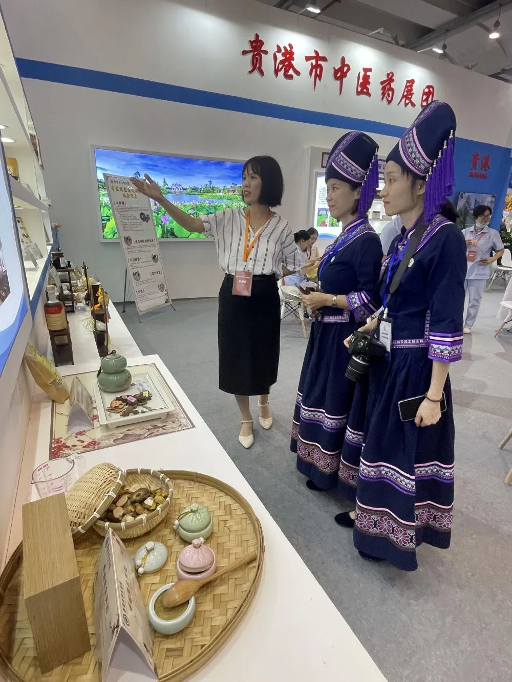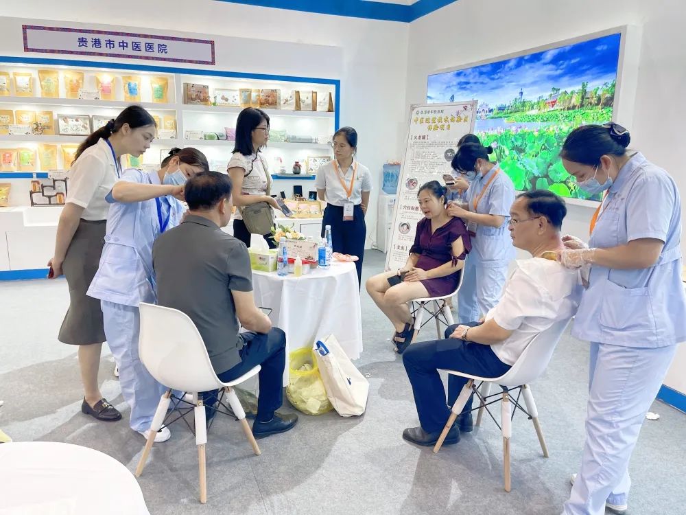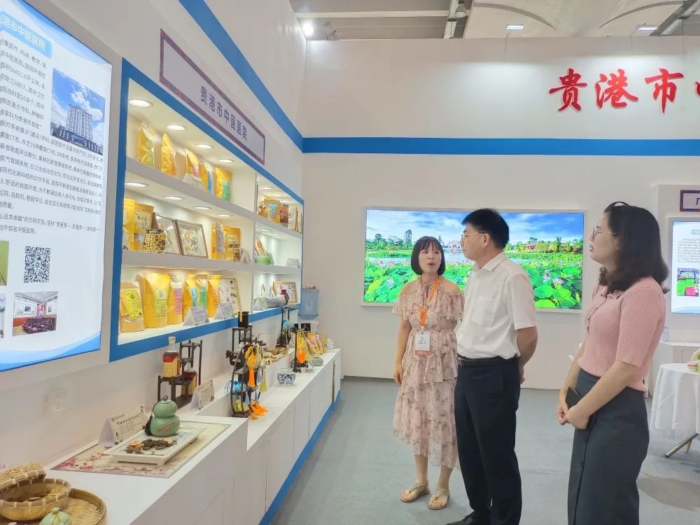 自治区中医药管理局党组成员、副局长张玉军,贵港市卫生健康委员会主任苏干秋,市中医药管理局局长张鉴泉以及贵港馆内其他兄弟单位的领导参观了我院的中医药展示区。副院长卢家灵及业务骨干陈丽冰介绍了医院的中医特色优势技术以及医院中医文化内涵,现场展示了并体验了虎符铜砭刮痧、穴位贴敷等中医特色疗法。参观的领导及嘉宾对我院浓厚的中医药文化氛围与中医药技术产品表示肯定。