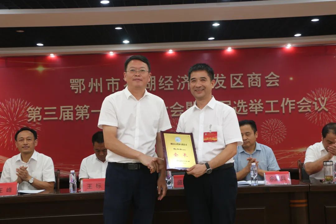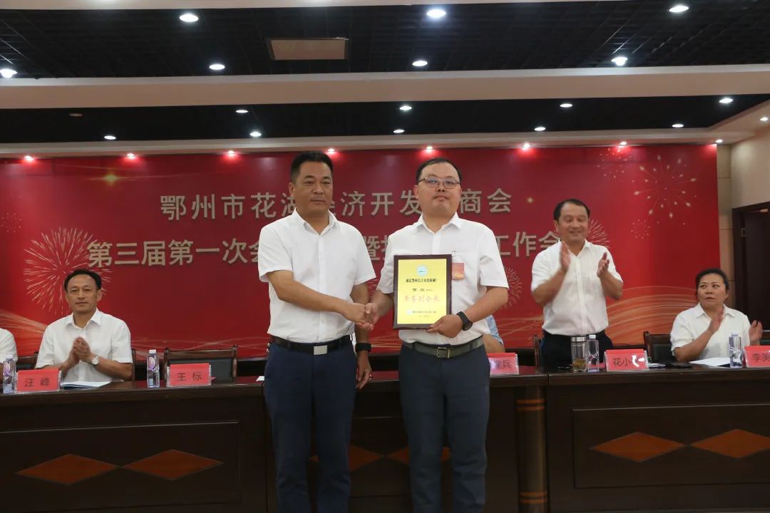 鄂州市工商联党组成员、副主席、秘书长盛以茂,鄂州市民政局副县级领导干部余建兵,鄂城区区委常委、区委统战部部长、樊口街道党工委书记王标,鄂城区人大常委会副主任、花湖经济开发区党工委副书记、花湖镇党委书记花小平出席会议并讲话。
