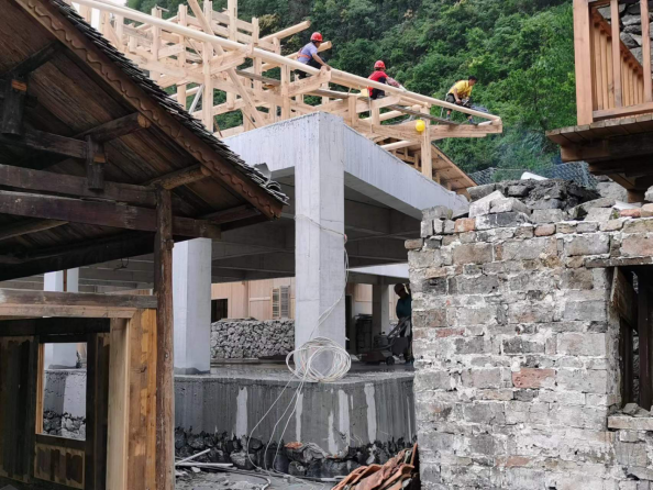 尧古,总体进度77%。入口景观完成池塘周边草皮铺设,形象进度约86%;砖混立面改造完成1栋景观石墙砌筑,推进剩下2栋景观石墙砌筑,形象进度约93%;村史馆、傩戏馆、蜡染坊、布依人家进行水电安装、木门窗安装及木结构家具制作,形象进度约88%;种子餐厅进行木结构家具制作、水电安装及厨房设备抽油烟机安装,形象进度约91%;生物综合馆完成地面找平,推进一层水泥砖墙砌筑,形象进度约55%;木房修缮改造进行楼板、墙板制作安装,形象进度约52%;杜庆伟工作室完成一层砖墙砌筑,进行2层砖墙砌筑及墙板制安,形象进度约80%;农耕文化帐篷营地推进水电安装,形象进度约85%。