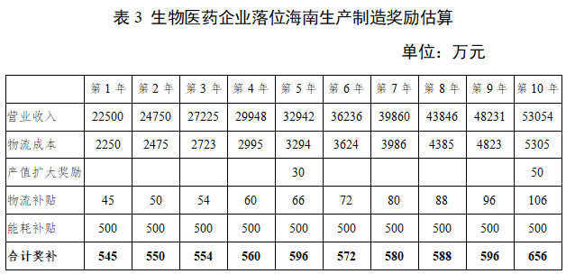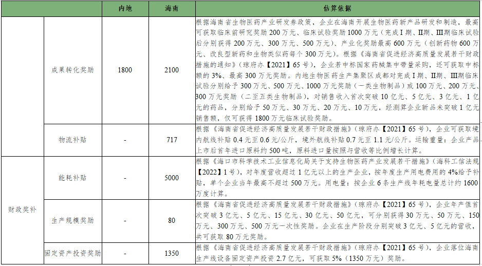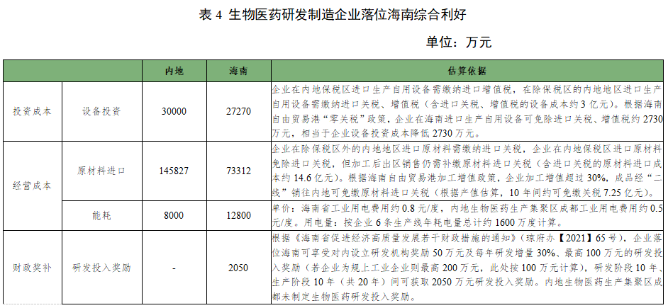 海南自由贸易港政策下,与以成都为代表的内地相比,固定资产投资约可节省约2730万元;产品研发阶段(10年)及产品上市后阶段(10年),原材料进口、物流、能耗等经营成本(计入物流、能耗补贴)可节省约7.3亿元,还可多获取研发创新和产成果转化奖励约2350万元、生产规模奖励约80万元、固定资产投资奖励约1350万元。