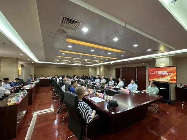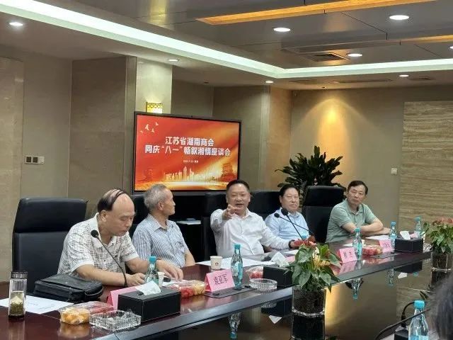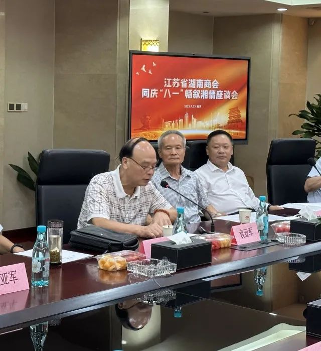 “八一”建军节即将来临之际,江苏省湖南商会于7月23日下午,在南京召开在宁湘籍部队老同志座谈会,大家欢聚一堂,同庆“八一”,畅叙湘情,共商商会发展大计,以致敬中国军人并感谢大家长期以来对商会的关心和支持。原南京军区空军副司令员袁亚军、原南京军区空军副政委胡春福、原解放军通信工程学院院长邵勋、江苏省工商联党组成员、副主席熊杰,原江苏省民政厅副厅长刘亚军、原宏光集团党委书记刘新安等现役及退转湘籍军人代表,武汉大学江苏校友会会长史照良、华融公司江苏公司总经理丁忠鸿等嘉宾,以及省商会创会会长、宇业集团董事长周旭洲,首席执行会长、宇业集团轮值总裁郭磊峰,执行会长周升俊、杨子晋、李小辉、杨和平、梁晓辉、张良、贺海军,秘书长肖德桥等共计50多人参加了本次座谈会。