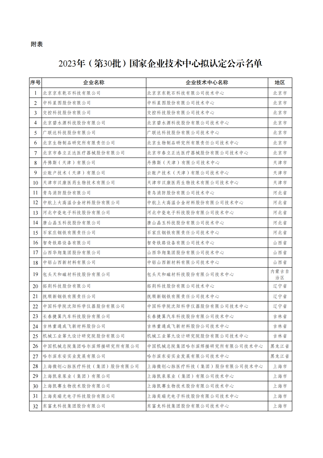 2023年(第30批)国家企业技术中心拟认定名单公示