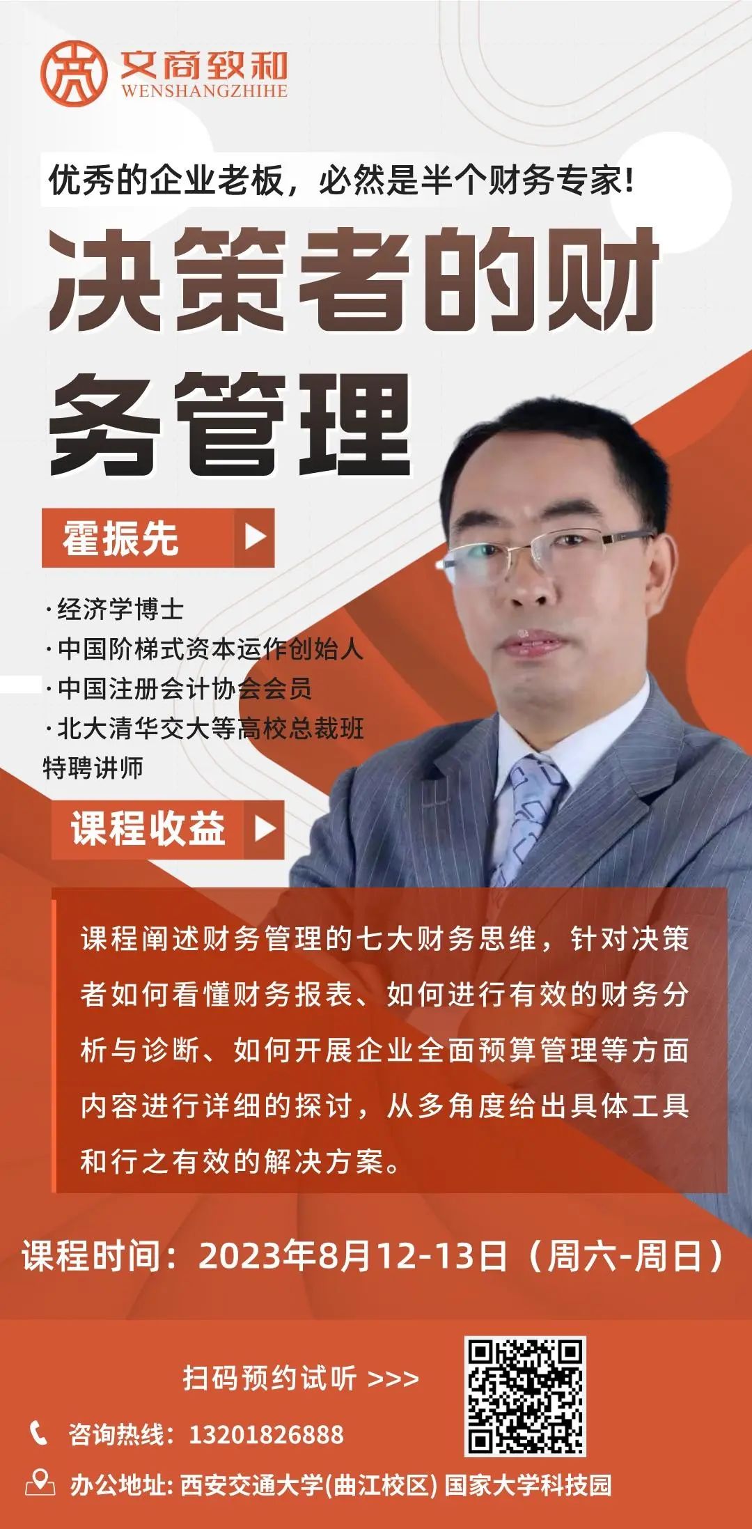 2023年8月12-13日,文商致和管理研究院八月课程。由霍振先老师主讲:《决策者的财务管理》,通财务出利润,不懂财务难管理!老板不懂财务,不会看报表,重市场轻财务,就会容易忽视财务风险,而企业持续健康发展,有效的财务管理是命脉!霍振先老师将通过幽默生动的讲解让您快速看懂财务报表、从财务角度审视企业各个环节的管理工作、有效实施财务成本控制、提高企业的竞争能力。