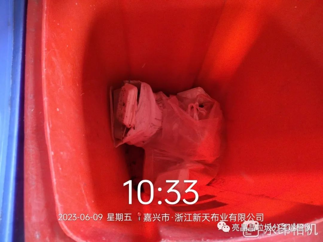 该企业上月检查到公共区域有害垃圾桶混放,办公区域存在脚边桶的问题,本月检查以上问题均已改善,设施设备都符合规范,台账做的认真仔细。