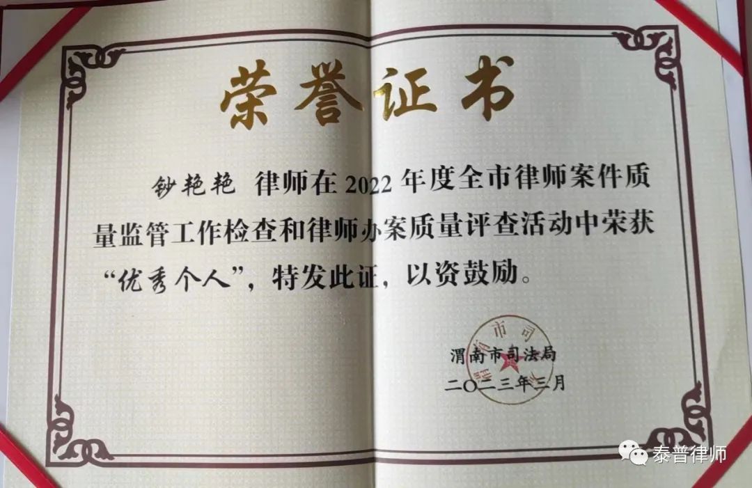 表彰大会在雄壮的国歌声中开幕。陕西泰普律师事务所支部委员会荣获中共渭南市律师行业委员会“先进党支部”,赵琼律师荣获渭南市律师行业“优秀共产党员”称号。陕西泰普律师事务所荣获“2017-2021年度陕西省优秀律师事务所”,武阿娟律师荣获2020-2022年度渭南市“十佳律师”,赵琼律师荣获2020-2022年度渭南市“市级优秀律师”,钞艳艳律师荣获“渭南市律师办案质量评查优秀个人”等荣誉。