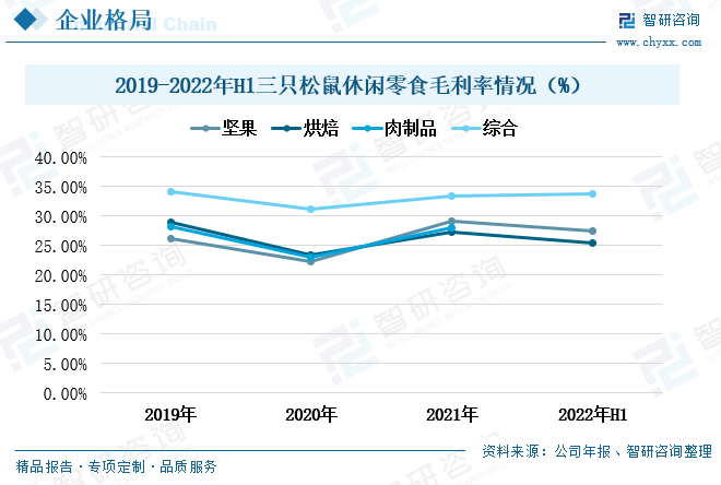 2019年至2021年,三只松鼠的各类休闲零食的毛利率涨跌幅度较小,坚果产品、烘焙产品以及肉制品的毛利率均在20%至30%之间上下波动,而其他综合类产品的毛利率也始终稳定在30%至35%之间。2022年上半年,三只松鼠的坚果产品毛利率为27.37%、烘焙产品毛利率为25.46%、综合产品的毛利率为33.66%,较上一年度同期均下降了1至5个百分点,这主要是由于2022年上半年,国内疫情反复,影响到市场消费活力,同时物流运力供给受到限制,导致休闲零食业务受到影响。
