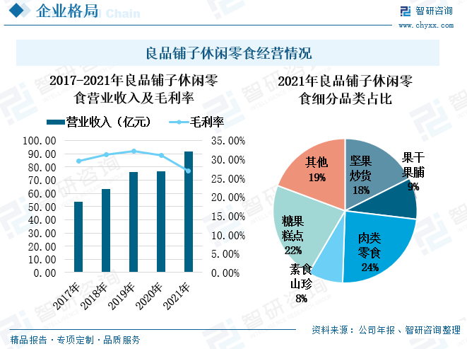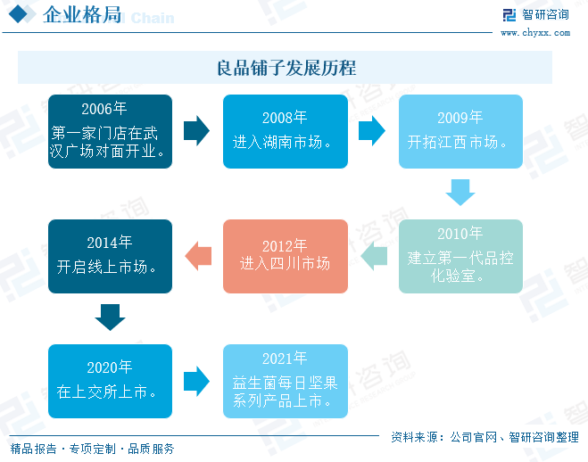 良品铺子主要从事休闲食品的研发、采购、销售、物流配送和运营业务,2006年成立于湖北省武汉市,并持续向周边省市布局,2008年进入湖南市场,紧接着在2009年开拓江西市场,并持续向外辐射,2014年良品铺子从线下经营拓展至线上运营,开通线上线下双渠道运营。良品铺子坚持以产品创新和渠道发展双轮驱动,将“高端零食”确立为企业发展的方向,致力于为消费者提供高品质、高颜值、高体验、健康营养的产品,目前其已经逐渐发展成为经营全品类零食,多品牌运营、全渠道均衡布局、全产业链协同的平台化、数字化、产品科研创新型零售企业。经过十几年的发展,良品铺子已经从最初的小店逐步蜕变为现今的平台级企业,并于2020年完成上市,成为我国休闲零食行业的领先企业。