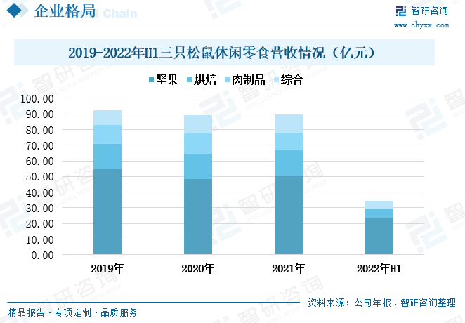 三只松鼠发展之初,其零食产品以坚果类产品为主,同时逐渐向烘焙、肉制品等零食细分领域布局,目前三只松鼠已经构建以坚果、果干、烘焙、肉制品为核心品类的休闲食品产品体系。2019年至2021年,三只松鼠的休闲零四营业收入基本稳定在90亿元左右,其中坚果类零食的营业收入始终占到休闲零食收入的50以上。2022年上半年,受休闲零食产销量下滑的影响,营业收入也出现一定程度的下滑。2022年上半年,三只松鼠的休闲零食营业收入合计34.61亿元,较上一年度同期减少了20%左右。