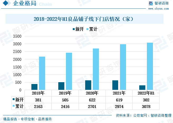 良品铺子采取全渠道销售模式,广泛通过线上、线下各类渠道向用户提供产品和服务。良品铺子持续优化线下门店的全国布局,同时以门店为中心向周边辐射,依托本地生活服务、社区团购、微信生态等,开发优质离店资源,挖掘潜在用户。2018年至2021年,良品铺子的新开门店数量基本保持增长趋势,其线下门店数量持续增多。2021年,良品铺子新开门店数达619家,在全国累计门店数量将近3000家。2022年上半年,良品铺子在全国新开门店302家。截至2022年上半年,良品铺子的线下门店数量达3078家,遍及全国超20个省份,将近200个城市。