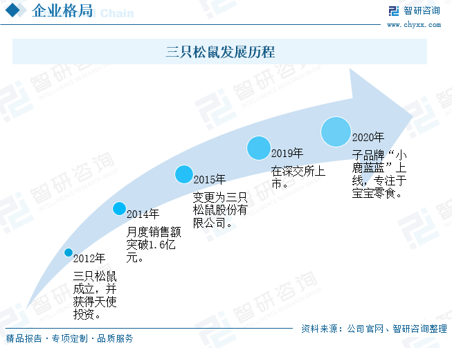 三只松鼠创立于2012年,成立之初在淘宝天猫商城是运营商上线,7天时间便完成了1000单的销售,上线65天,便快速跃居天猫坚果类目第一名。三只松鼠坚持创新发展之路,不断致力于产品的创新,并加速向数字化供应链平台企业转型。三只松鼠经过十年的发展,逐渐构建起覆盖研发、采购、生产、检测、仓储、物流等全链路的供应链管理体系,还成功打造出销售额超10亿大单品每日坚果,碧根果、夏威夷果、纸皮核桃、手剥巴旦木、蜀香牛肉等近20款亿级单品。三只松鼠已经逐渐发展成为国内规模领先的以坚果为主的休闲食品品牌,并于2019年完成上市。2020年,三只松鼠还推出了其子品牌“小鹿蓝蓝”,专注于宝宝零食,进一步拓宽其业务布局范围。