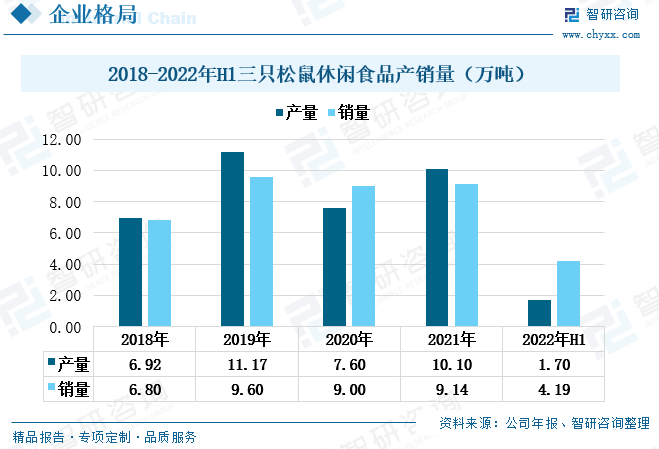 随着国民经济稳健快速增长,我国人均收入水平得到显著提升,我国消费市场活力旺盛。同时,我国物流行业快速发展并日渐成熟,为休闲零食行业的发展提供有力支撑,我国休闲零食行业快速发展。三只松鼠起源于电商,经过十年的摸索于调整,已从“线上单一渠道”发展成为“线上渠道各平台平衡发展、线上线下全渠道均衡发展”的销售网络。三只松鼠的销售渠道分为线上和线下两部分,线上以天猫、京东、唯品会等网络购物平台为主,线下形成了以投食店及联盟小店为代表的零售渠道。2019年,三只松鼠的休闲食品产销量均出现较大幅度的上涨,产量突破10万吨。但到2020年三只松鼠的休闲食品产销量均出现不同幅度的下滑,产量降至7.6万吨,销量降至9万吨。这主要是由于2021年货节后移,备货时间相应后置于2021年1月,使得2020年三只松鼠休闲食品产销量较上一年度大幅减少。2022年上半年,三只松鼠的休闲食品产量为1.7万吨,销量为4.19万吨,较上一年度同期均有所下滑。一方面是由于上半年疫情反复,物流运输受限导致线上订单受到影响,另一方面是由于三只松鼠进行内部调整,主动关闭不符合长期发展的门店,积极探索新模式,使得产销量受到一定程度的影响。