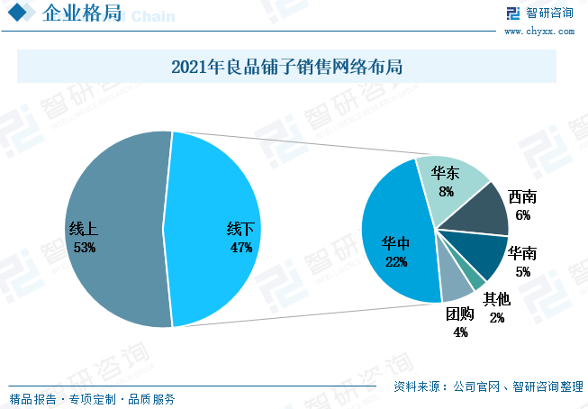 良品铺子成立初期就以武汉为核心,不断向四周的城市辐射,陆续进入湖南、江西、四川等市场。随着良品铺子的快速发展,其也加速了在关键城市的布局渗透,聚焦新一线城市密集开店,进一步加速华南、西南及华中关键市场的布局深度和密度。2021年,良品铺子的线下营收占公司营收的47%,其中主要分布在华中地区,占比为22%,其次使华东地区,占比为8%。